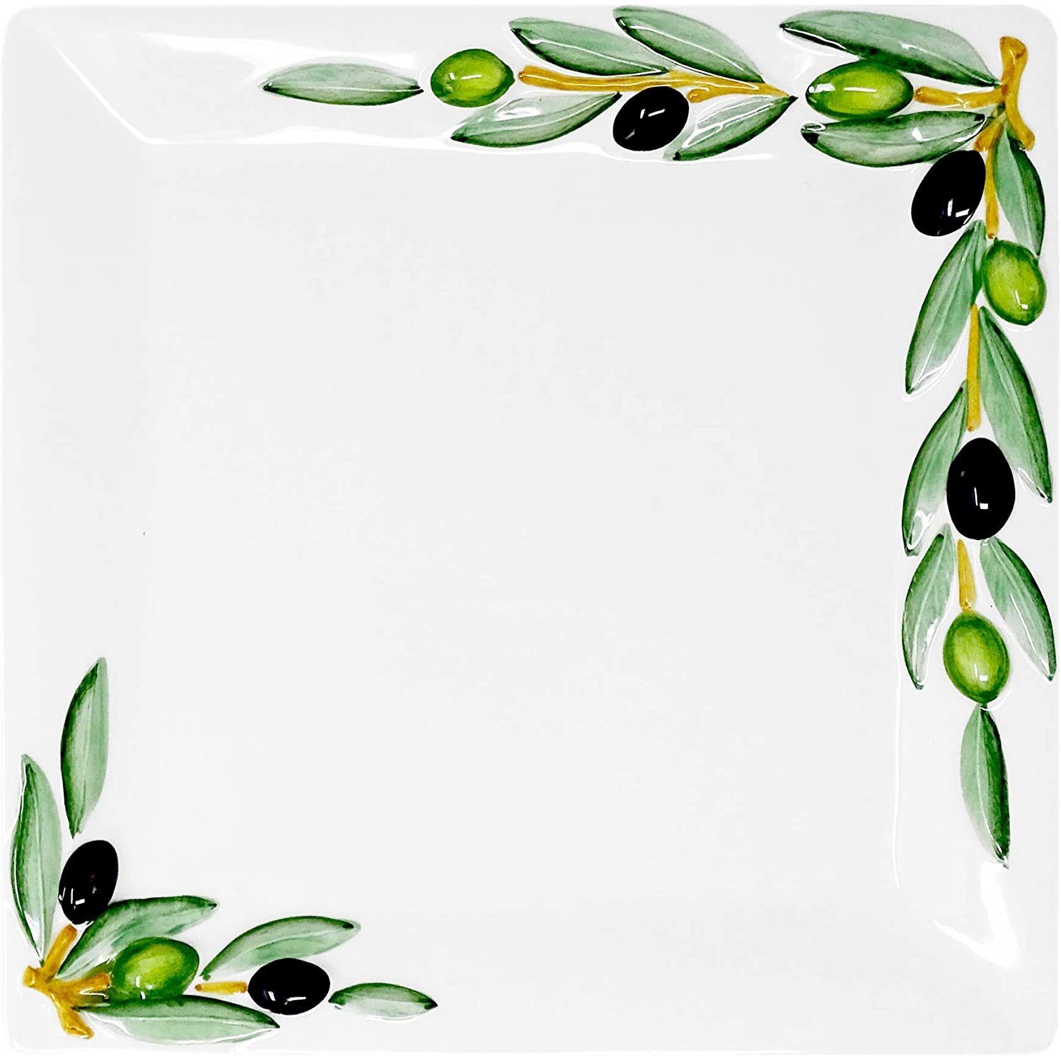 Jeder Keramikteller ist ein Unikat: unsere handgearbeitete Servierplatte aus italienischer Keramik besticht mit ihrem schlichten Oliven Design. Der quadratische Servierteller ist mit Reliefs in Form von Olivenzweigen geschmückt. Ausgehend von der einen Ecke des Keramik Tellers verzweigen sich je ein Strang mit Olivenblättern und Olivenfrüchten über die Längsseiten des Dekotellers. In der gegenüberliegenden Tellerecke verziert ein kleiner Olivenzweig den Rand der Tapasplatte. Die Maße der Antipastiplatte belaufen sich auf ca. 27 x 27 cm, genug Platz für leckere Tapashäppchen oder Fingerfood. Der Anrichteteller ist ca. 1 cm tief und ca. 2,5 cm hoch.
