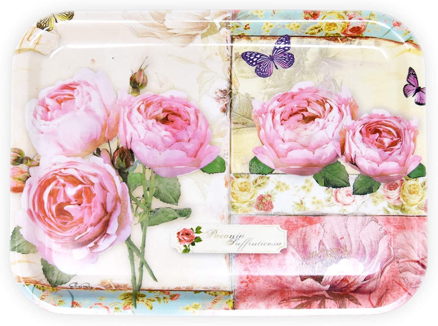 Holen Sie sich mit dem detailliert gemalten Motiv England Rosen des Gartentabletts etwas Natur in Ihre Küche. Die zauberhaften, rosa Rosen und die zarte Flora und Fauna im hellgelben Hintergrund erinnern an einen entzückenden Garten. Unser leicht glänzendes Melamintablett schaut aus wie Keramik und ist liebevoll in Italien hergestellt.