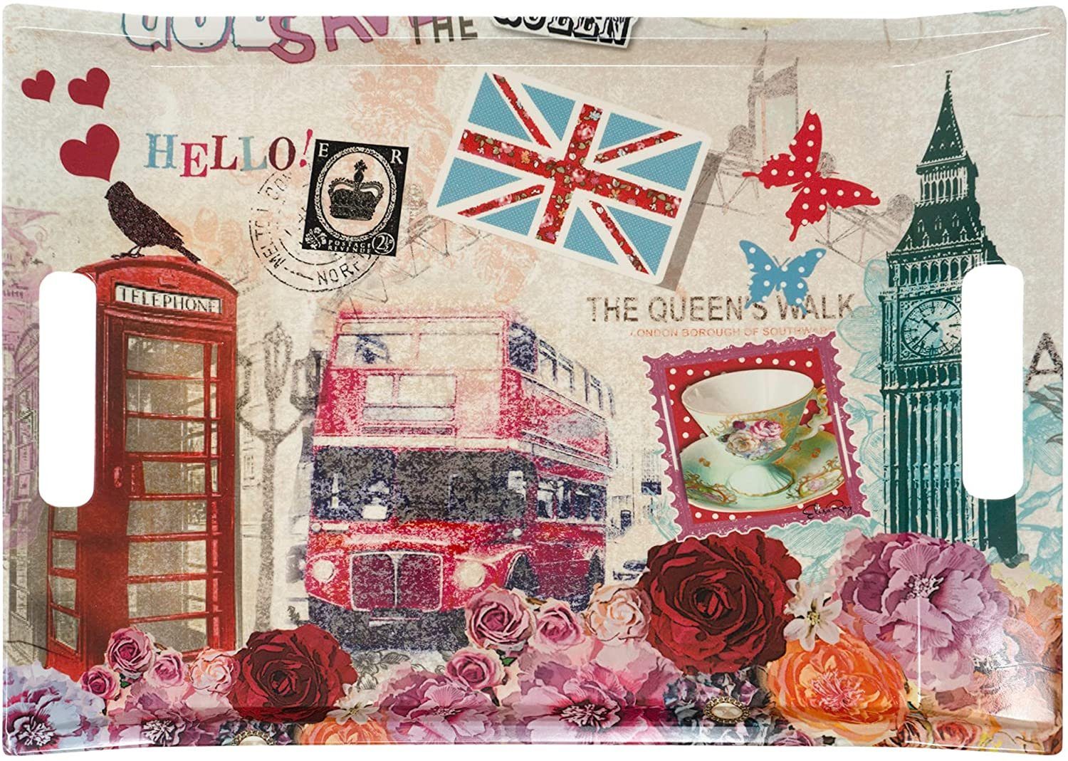 Nicht nur praktisch, auch optisch weiß unser modernes Melamintablett zu begeistern. Great Britain zieht dank des Tablett Motives ein! Der Big Ben, ein Londoner Bus, der Union Jack sowie eine Telefonzelle hüllen Ihre Küche in englisches Flair! Dank der leicht glänzenden Oberfläche erweckt unser großes Picknicktablett den Eindruck von Keramik.