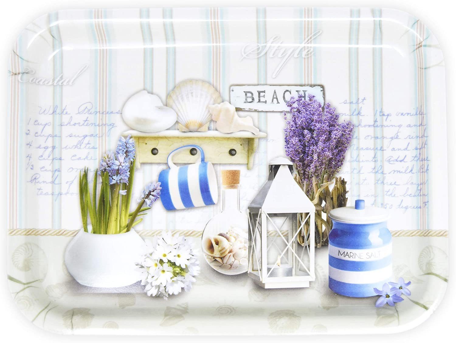 Bei diesem sand-gelben Motiv Strandoase auf dem Speisetablett holen Sie sich den Strand direkt zu Ihnen nach Hause. Maritime Gerichte schmecken sicher auf dem Design aus Muscheln und duftenden, violetten Lavendel sowie blauen Tassen doppelt lecker. Im Hintergrund erinnert eine zarte, blaue Schrift an gestrandete Flaschenpost. Unser leicht glänzendes Melamintablett schaut aus wie Keramik und kommt aus Italien.