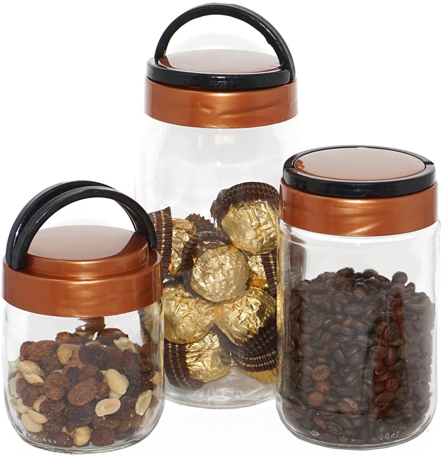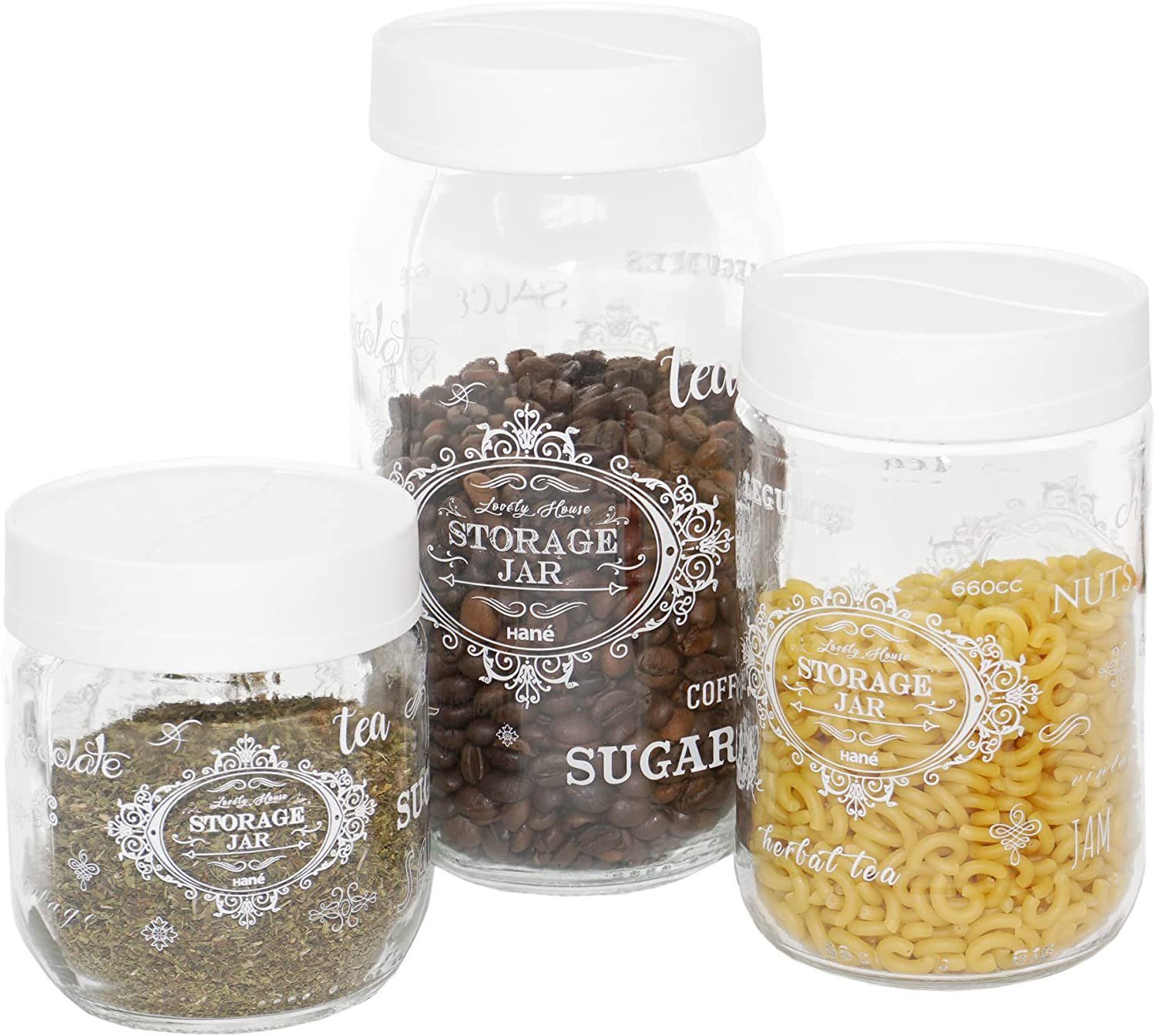 Ob als Mehldose, Kaffeebohnen Behälter, Gewürzdosen oder für leckere Kekse, unsere leeren Aufbewahrungsgläser möchten Sie nicht mehr hergeben. Perfekt verstauen Sie in diesen transparenten Glasdosen Lebensmittel wie Tee, Kaffee, Salz oder knusprige Cornflakes. In einem 3er Dosen Set erhalten Sie 3 Stück Vorratsbehälter in drei verschiedenen Größen. Unsere kleine Mehldose hat die Maße ca. 7 Ø x 10 cm sowie die Füllmenge ca. 425 ml, die mittlere Kaffeedose misst ca. 7 Ø x 14 cm cm mit einer Füllmenge ca. 660 ml und in die große Aufbewahrungsbox ca. 7 Ø x 19 cm cm passen ca. 1000 ml. So sind genug Ihrer Kochzutaten und Lebensmittel mit unseren edlen Schraubgläsern mit Deckel aufbewahrt.