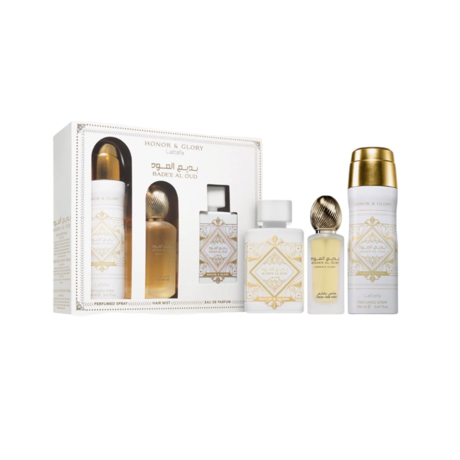 Besondere Anlässe erfordern besondere Präsente – egal, ob Sie mit ihnen sich selbst oder Ihre Liebsten glücklich machen wollen. Im Geschenkset Lattafa Badee Al Oud Honor & Glory finden Sie eine sorgfältig ausgewählte und mit Liebe zusammengestellte Kombination von Düften und Kosmetikprodukten, die garantiert ein Lächeln ins Gesicht zaubern – und zwar unabhängig davon, ob Sie oder Ihre Liebsten alle Produkte auf einmal oder nach und nach im Laufe eines Monats ausprobieren.