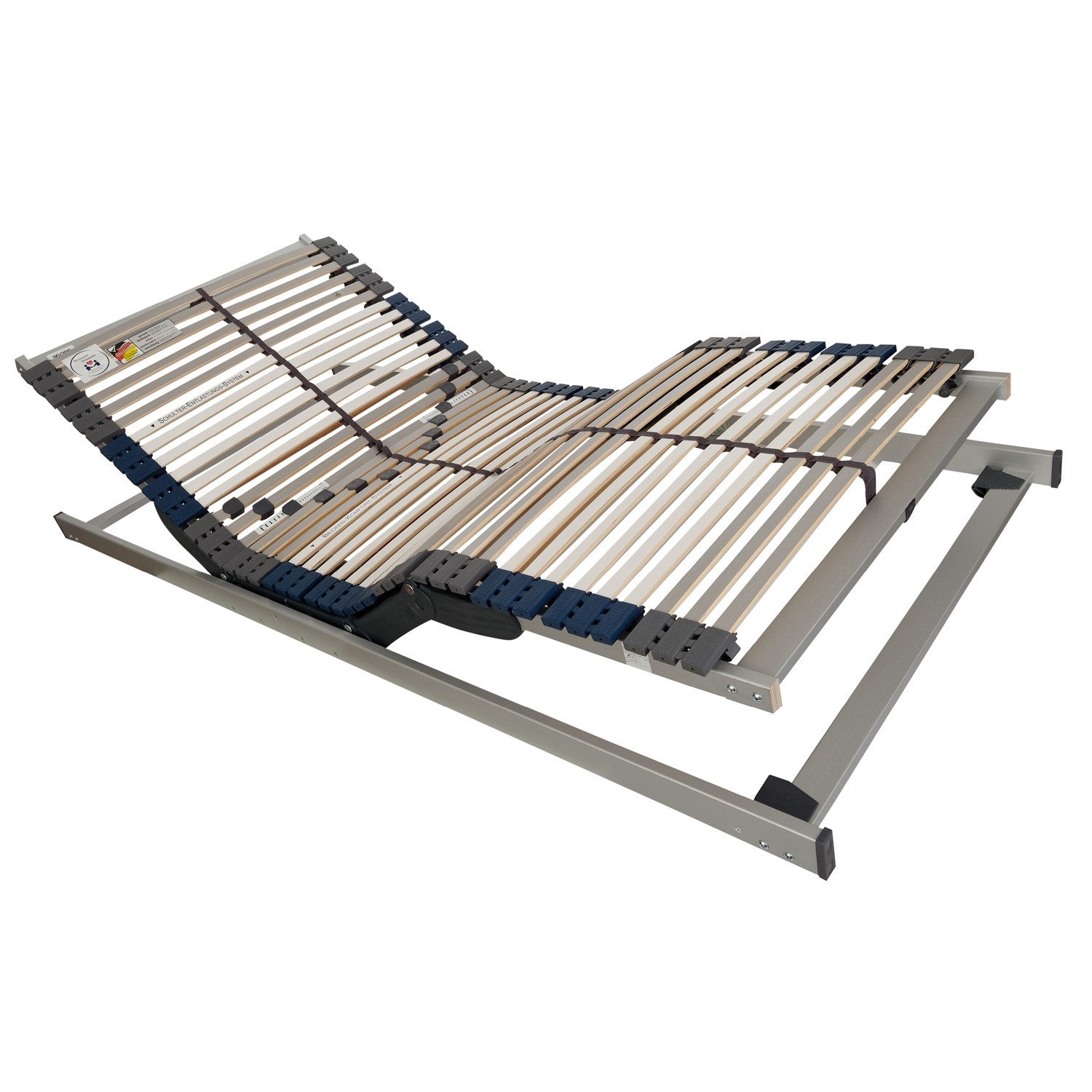 Motor ist im Rahmen verbaut, dadurch geeignet für alle Bettgestelle und Matratzentypen. Für Wellness-Komfort und eine perfekte Herz-Kreislauf-Entlastung. Inkl. Notabsenkung und ohne „Kabel-Wirrwarr“. Elektrischer Lattenrost wird komplett montiert geliefert. 7 Zonen Lattenrost – Made in Germany – universell geeignet für alle Bettgestelle, auch mit Bettkästen etc., bis 110 kg belastbar. 42 superelastische Federholzleisten (dank der 42 schmalen Leisten bis zu 50% elastischere und „punktgenauere“ Körperanpassung als bei herkömmlichen Lattenrosten mit 28 Federleisten. Kopf-, Rücken-, Ober- und Unterschenkelteil elektrisch per Handschalter zu verstellen, inkl. Notabsenkung. Geringer Stromverbrauch, auch im Stand-by-Modus. Flexible, bis an den Rand führende Abfederung (keine Besucherritze bei 2 Lattenrosten in einem Doppelbett) durch holmüberdeckende Trio-Federungselemente aus Synthese-Kautschuk. Individuelle 6-fache Härteregulierung im mittleren Liegebereich zur Anpassung an das Gewicht und die gewünschte Liegehärte. Hoher Federungskomfort durch dauerhaft formstabile Trio-Kappen aus Synthese-Kautschuk. Spezielle Schulter- und Beckenzone zur Entlastung der Wirbelsäule. Harmonische Druckverteilung und Stabilisierung durch Textilgurt (100% PP). Langlebig und stabil durch mehrfach-furniertes Schichtholz und Massivholz aus Birke und Buche. Antrieb TÜV / GS geprüft¹, inkl. Schutzummantelung gegen Feuchtigkeit. Für alle Matratzentypen geeignet, geringe Bauhöhe ca. 11 cm.