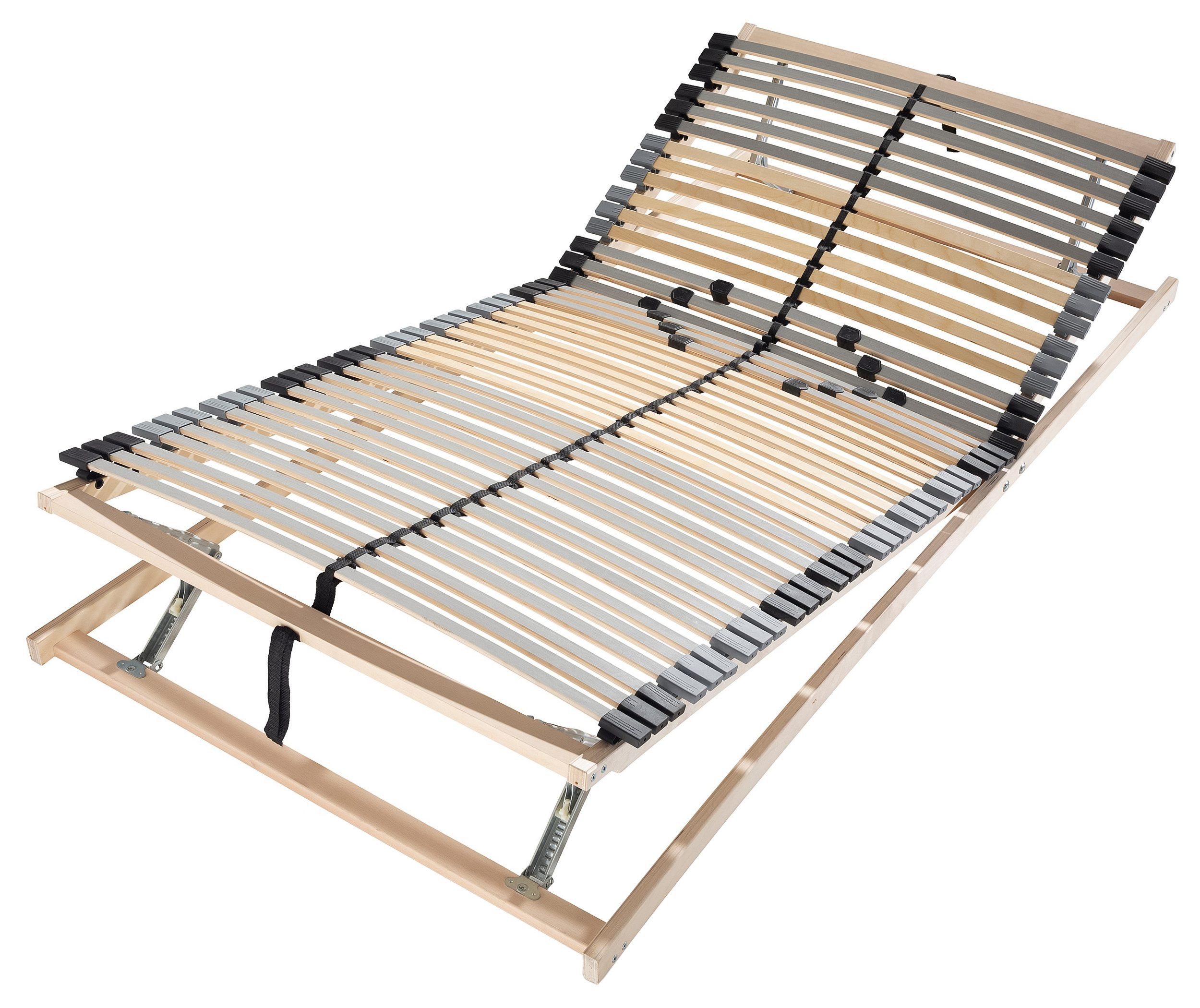 Aufbau: Manuell verstellbare Rückenteile und Fußteile. Die Leisten des Lattenrosts sind Holmaufliegend und bieten daher einen ganzflächigen Liegekomfort über die gesamte Breite