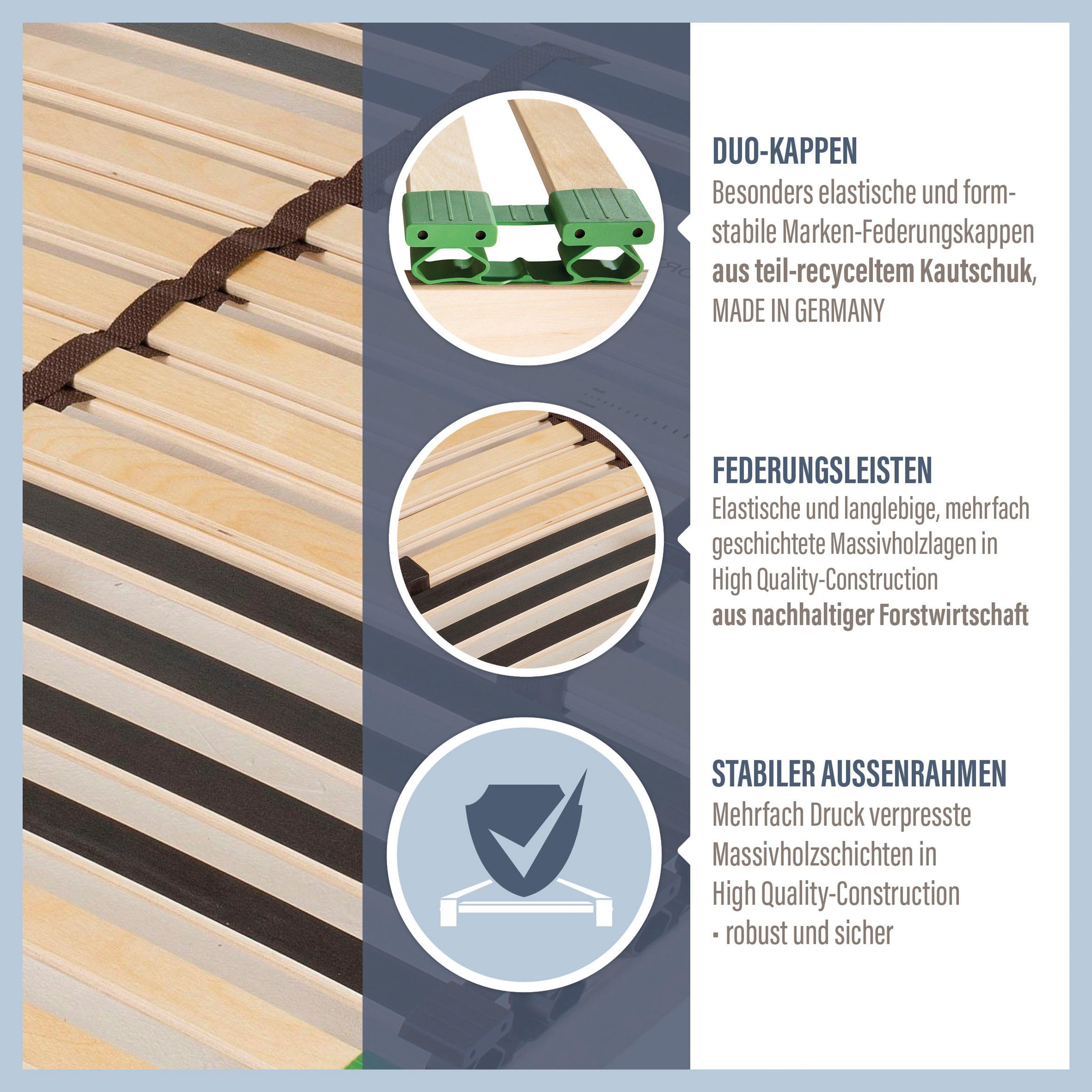 Top-Features | Die Kappen sind holmüberdeckend gelagert. Sie bieten einen besseren Komfort, da sie eine höhere Federung zulassen. Die Matratze ist komplett bis zum Rand hin unterfedert - liegen zwei Lattenroste nebeneinander, entsteht somit keine Besucherritze. Doppelleisten zur Härtegradregulierung - Dieser Lattenrost ermöglicht es, individuelle Einstellungen vorzunehmen: Seitenschläfer stellen sich eine weiche Schulterzone ein, Bauchschläfer eine stärkere Stützfunktion, damit die Wirbelsäule nicht »durchhängt«. Je mehr Doppelleisten, desto genauer und besser kann die Einstellung erfolgen. |