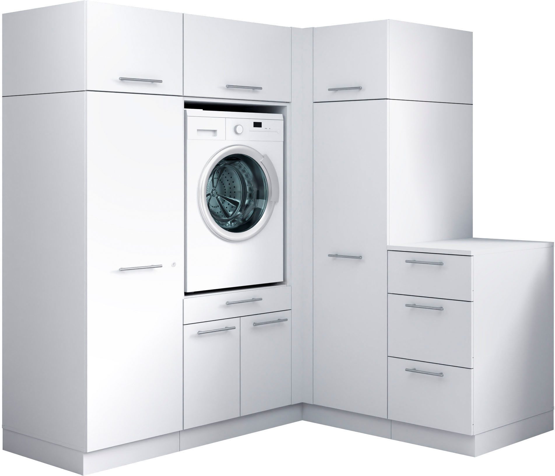 Set beinhaltet | 1x Aufsatzschrank 50, 1x Aufsatzschrank 68,1x Eckaufsatzschrank 38,1x Waschmaschinenschrank, 1x Hochschrank, 1x Eckschrank, 1x Unterschrank |