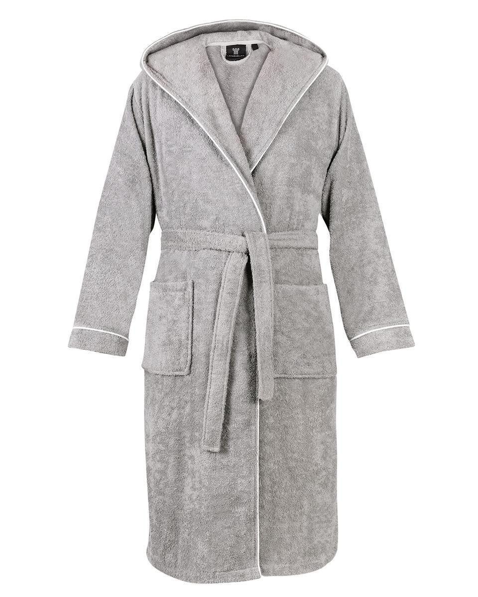 Fein eingefasste, rundherum weiße Paspeln an Kragen und Ärmeln setzen elegante Akzente und sorgen für einen stilvollen Kontrast, der dem Bademantel ein besonderes, edles Detail verleiht.