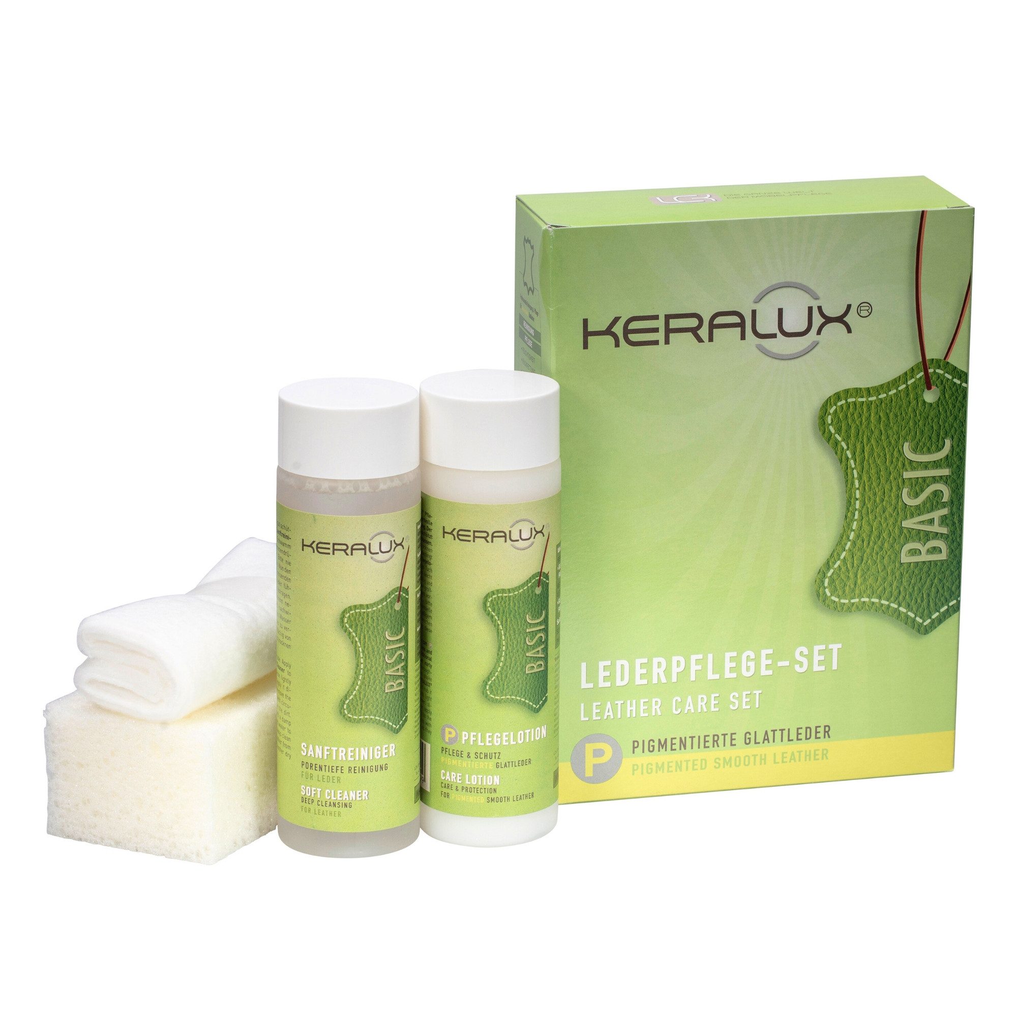 KERALUX® Lederpflege-Set P für pigmentierte Glattleder, Semi-Anilin & Longlife-Leder Das KERALUX® Lederpflege-Set P ist die ideale Lösung für die anspruchsvolle Reinigung und Pflege pigmentierter Glattleder sowie Semi-Anilin- und Longlife-Leder. Mit diesem 4-teiligen Set sorgen Sie dafür, dass Ihr Ledermöbel nicht nur optisch einwandfrei aussieht, sondern auch langanhaltend seinen hochwertigen Charakter bewahrt. Perfekte Reinigung für den Alltag Ob Jeansabfärbungen, hartnäckige Fettflecken oder Schokoladenkrümel auf dem Ledersofa – der KERALUX® Reiniger Aktiv Plus entfernt mühelos viele Arten von alltäglichen Verschmutzungen. Sogar schwierige Verunreinigungen wie Abfärbungen dunkler Kleidung, fettige Rückstände von Sonnencreme oder speckige Nutzungsstellen lassen sich gründlich beseitigen. Mit dem KERALUX® Reiniger Aktiv Plus ist Ihr Leder stets bestens gepflegt. Schonende Anwendung für optimale Ergebnisse Das Auftragen des Reinigers könnte einfacher nicht sein. Der Reiniger wird mit einem weichen Schwamm aufgetragen, der vorab leicht angefeuchtet wird, um einen feinporigen Schaum zu erzeugen. Mit sanften, kreisenden Bewegungen gleitet der Schwamm über das Leder und entfernt dabei Schmutzpartikel effizient und schonend zugleich. Besonders bei stärker strukturiertem Leder sorgt die mitgelieferte weiche Reinigungsbürste dafür, dass auch tiefersitzende Verschmutzungen mühelos entfernt werden. Dank des enthaltenen Pflegetuchs wird das Finish vollendet und das Leder erstrahlt in seinem ursprünglichen Glanz. Premium-Qualität für hochwertige Ledermöbel Das KERALUX® Lederpflege-Set P ist speziell auf die Pflege von Premium-Ledermöbeln von Marken wie Rolf Benz, W.Schillig, Brühl oder Koinor ausgelegt. Dabei wird nicht nur Wert auf makellose Sauberkeit, sondern auch auf die Langlebigkeit des Leders gelegt. Vorteile auf einen Blick: Entfernt hartnäckige Verschmutzungen wie Abfärbungen, Fett oder Ölrückstände. Sanft und dennoch effektiv dank speziell entwickelter Reinigungskomponenten. Für hochwertige Ledermöbel führender Marken geeignet. Enthält alles, was Sie für eine gründliche Lederpflege benötigen: Reinigungsschwamm, Reiniger Aktiv Plus (200 ml), Reinigungsbürste und Pflegetuch. Tipp: Pflegen Sie Ihr Leder regelmäßig und reinigen Sie es stets großflächig von Naht zu Naht, um gleichmäßige Ergebnisse zu erzielen. Für empfindliche Oberflächen bitte destilliertes Wasser verwenden, um unschöne Kalkränder zu vermeiden. Verleihen Sie Ihren Ledermöbeln die Pflege, die sie verdienen, und genießen Sie das Gefühl von makelloser Reinheit und zeitloser Eleganz mit dem KERALUX® Lederpflege-Set P!