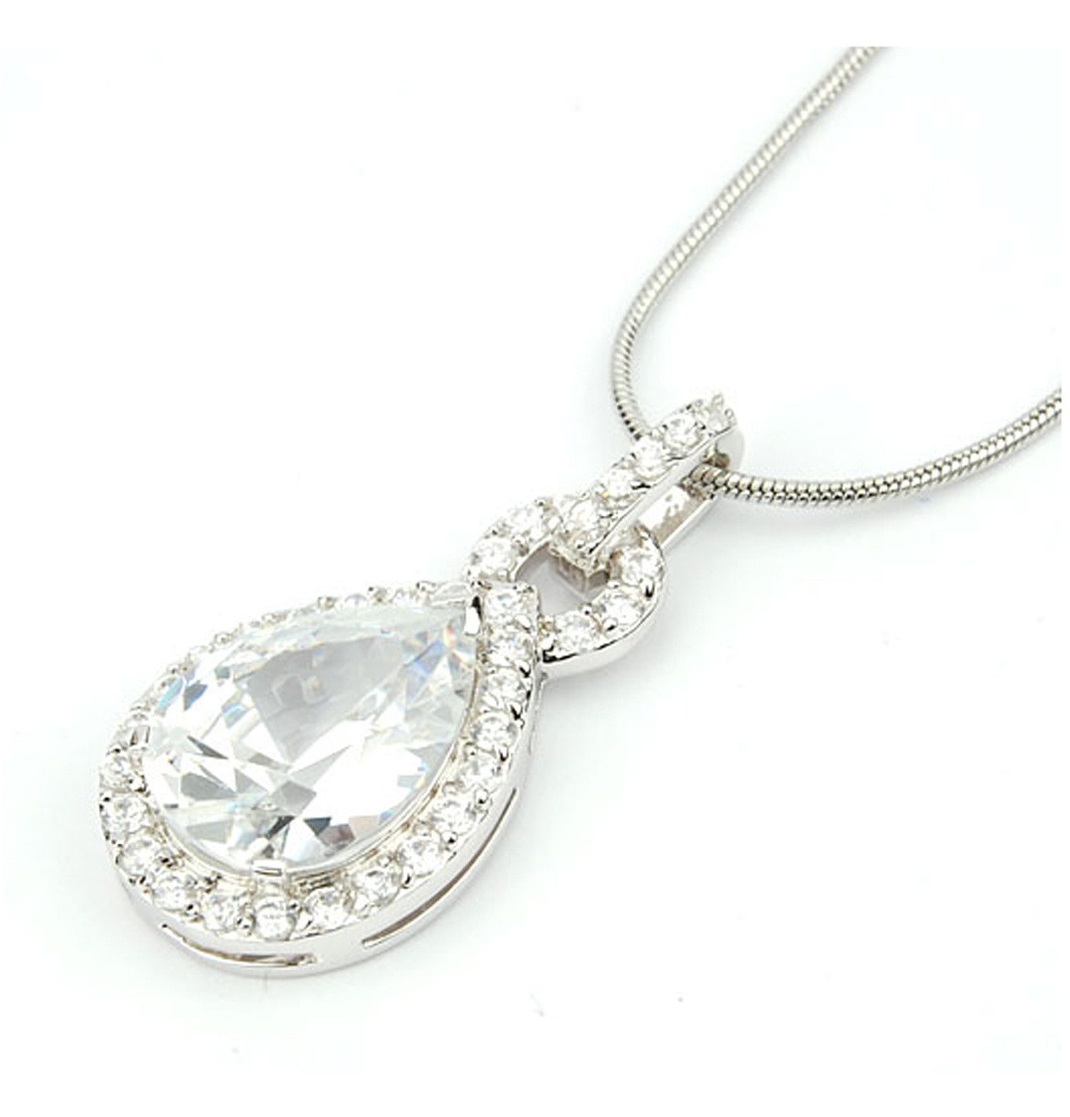Eleganter Anhänger mit einem facettierten Tropfen-Markenkristall aus Österreich an einer Schlangenkette. Der Tropfenkristall in der Farbe "Crystal" hat durch seine Длина von 17 x 12 mm, seinen Schliff und die feine, kristallbesetzte Fassung einen faszinierenden Effekt und ist ein absoluter Hingucker.