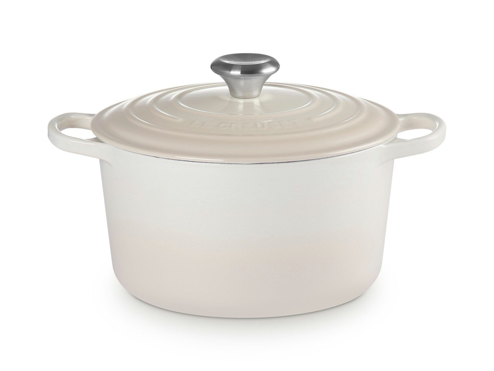 Dank der extrahohen Seitenwände verfügt der gusseiserne Topf in meringue von Le Creuset über ein enormes Fassungsvermögen. Ideal geeignet für die Zubereitung von Suppen, Eintöpfen und vielen anderen köstlichen Gerichten, besonders dann, wenn Sie für eine größere Gruppe kochen. Mit diesem Bräter können Sie mühelos Portionen für 8 bis 10 Gäste zubereiten.