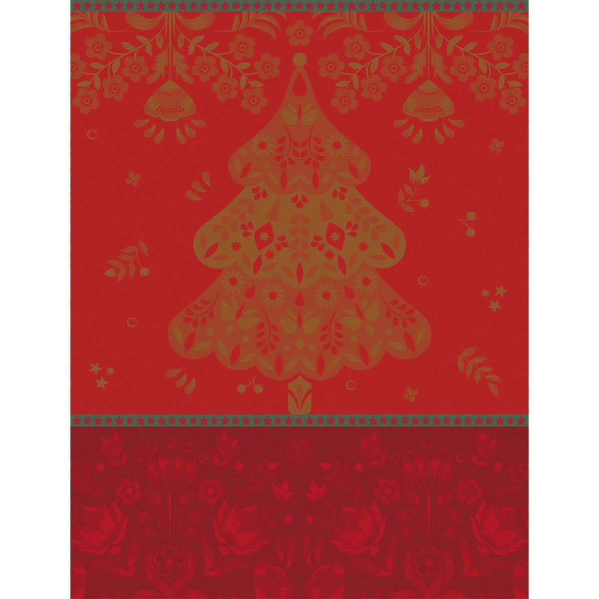 Pflegehinweise | MotivbeschreibungDieses Geschirrtuch zeigt ein festliches Weihnachtsmotiv mit einem stilisierten Weihnachtsbaum im Zentrum, der mit Blumen und Blättern verziert ist. Die Farbpalette ist von warmen Rottönen dominiert, die mit goldenen Akzenten für den Baum und die umgebenden Ornamente kombiniert werden. Ein grüner Rand mit Sternenmuster trennt den oberen Teil mit dem Baum von einem unteren Band mit einem detaillierten Blumenmuster in verschiedenen Rottönen, was dem Design eine reiche und festliche Tiefe verleiht. |