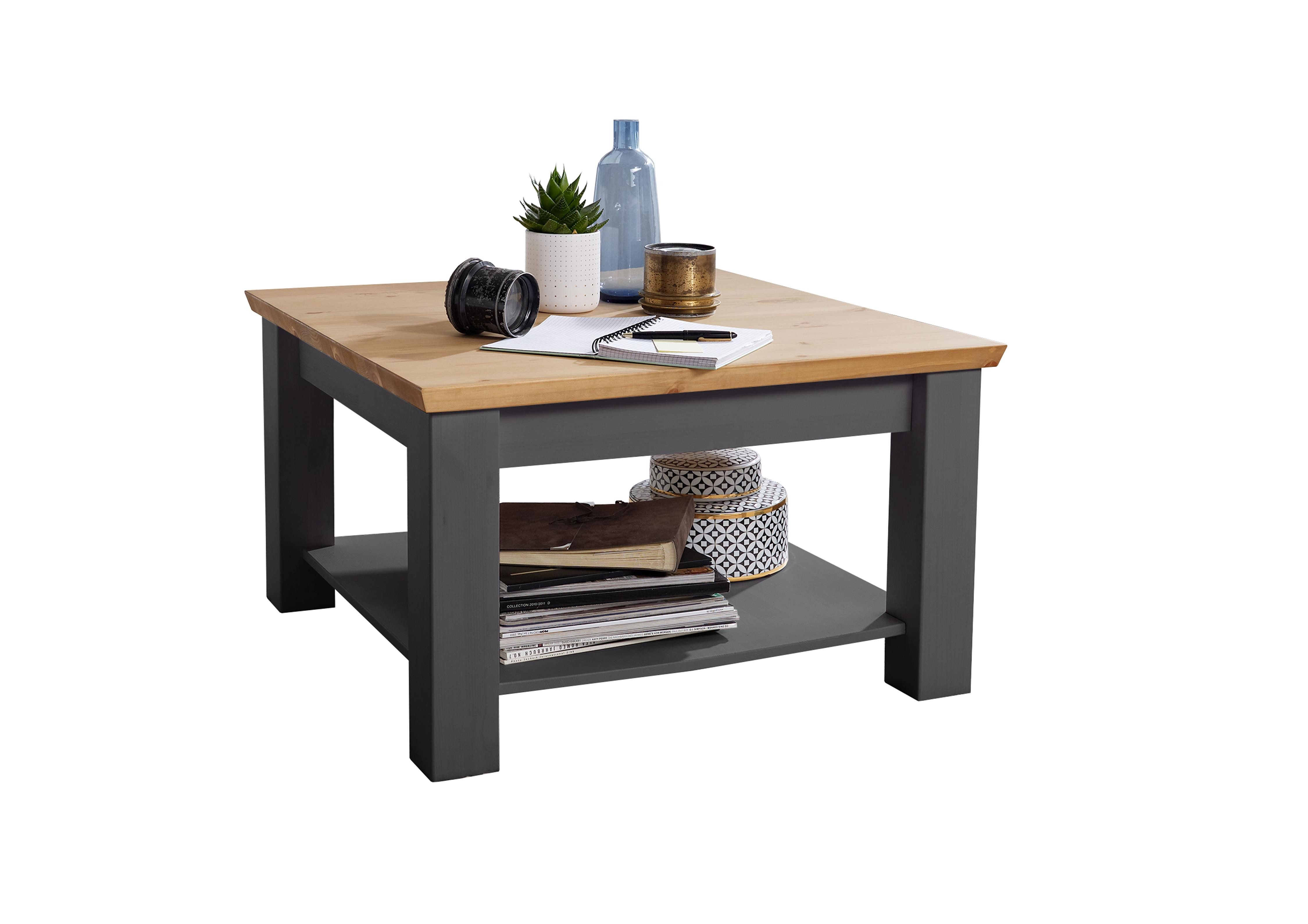 Gemütlicher Lebensraum mit Landhausflair Der Couchtisch WZ-0133 bringt zeitloses Landhausflair in Ihren Wohnraum. Die eichefarbige Deckelplatte sorgt für einen schönen Kontrast zur grau gewachsten massiven Kiefer. Ein Ablageboden unterhalb der Tischplatte sorgt für zusätzliche Fläche