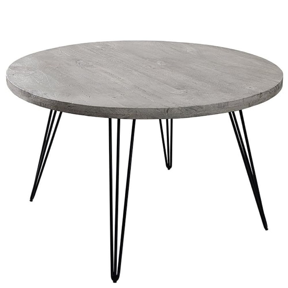 Bestelle jetzt den runden Massivholz Esstisch ALINA Grau aus Mangoholz und mit schwarzen Metallbeinen im Hairpin-Legs-Stil und bereichere dein Zuhause mit einem Möbelstück, das Natürlichkeit, Robustheit und puristisches Design in perfekter Harmonie vereint.
