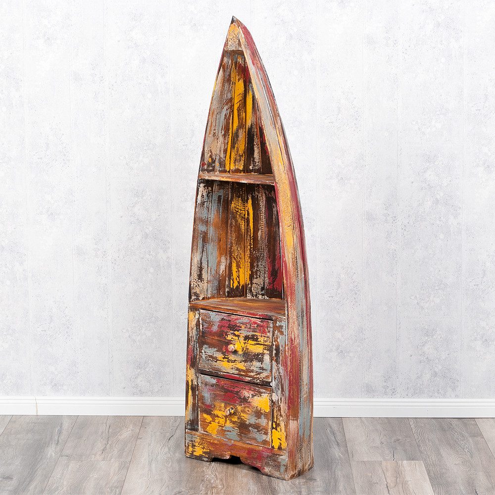 Dieses aussergewöhnliche Regal in Form eines Bootsrumpfes wurde in Handarbeit aus Albasia-Holz gefertigt. Durch die immer individuelle Farbgebung und kleinen Unebenheiten wird jedes dieser Regale zu einem Unikat und hat somit seinen eigenen, besonderen, unvergleichlichen Charakter. Die Ablagefächer bieten viele Möglichkeiten zum Dekorieren und Aufbewahren von z.B. Küchenutensilien, Büchern, Deko-Artikeln. Zudem schaffen die beiden unten liegenden Schubladen noch weiteren Stauraum.
