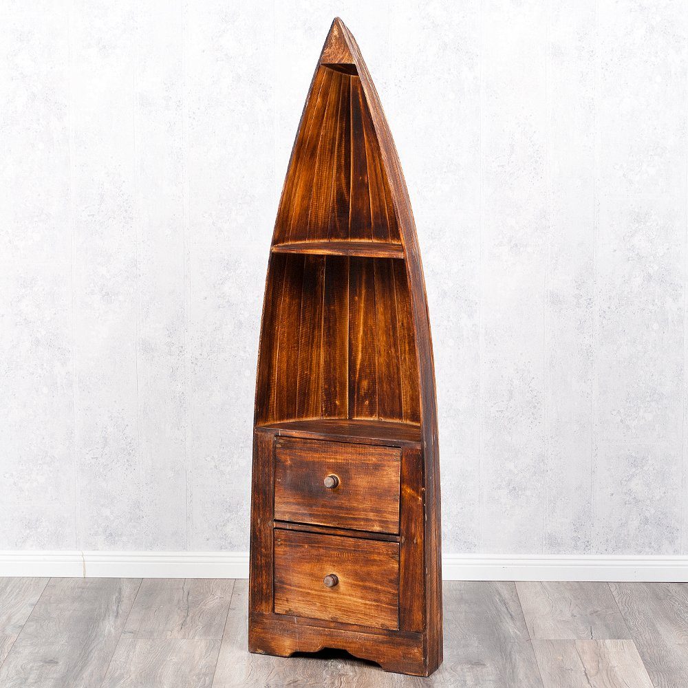 Dieses aussergewöhnliche Regal in Form eines Bootsrumpfes wurde in Handarbeit aus Albasia-Holz gefertigt. Durch die immer individuelle Farbgebung und kleinen Unebenheiten wird jedes dieser Regale zu einem Unikat und hat somit seinen eigenen, besonderen, unvergleichlichen Charakter. Die Ablagefächer bieten viele Möglichkeiten zum Dekorieren und Aufbewahren von z.B. Küchenutensilien, Büchern, Deko-Artikeln. Zudem schaffen die beiden unten liegenden Schubladen noch weiteren Stauraum.