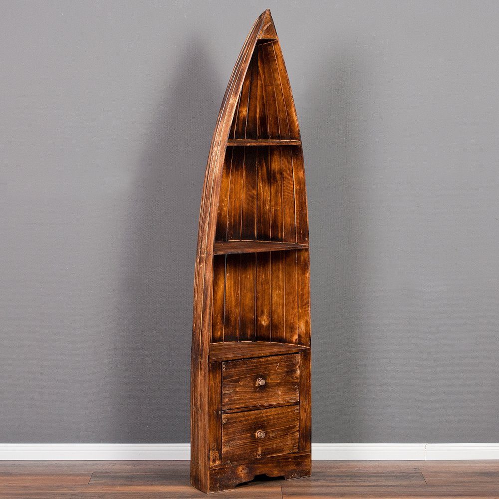 Dieses aussergewöhnliche Regal in Form eines Bootsrumpfes wurde in Handarbeit aus Mahagony-Holz gefertigt. Durch die immer individuelle Farbgebung und kleinen Unebenheiten wird jedes dieser Regale zu einem Unikat und hat somit seinen eigenen, besonderen, unvergleichlichen Charakter. Die Ablagefächer bieten viele Möglichkeiten zum Dekorieren und Aufbewahren von z.B. Küchenutensilien, Büchern, Deko-Artikeln. Zudem schaffen die beiden unten liegenden Schubladen noch weiteren Stauraum.
