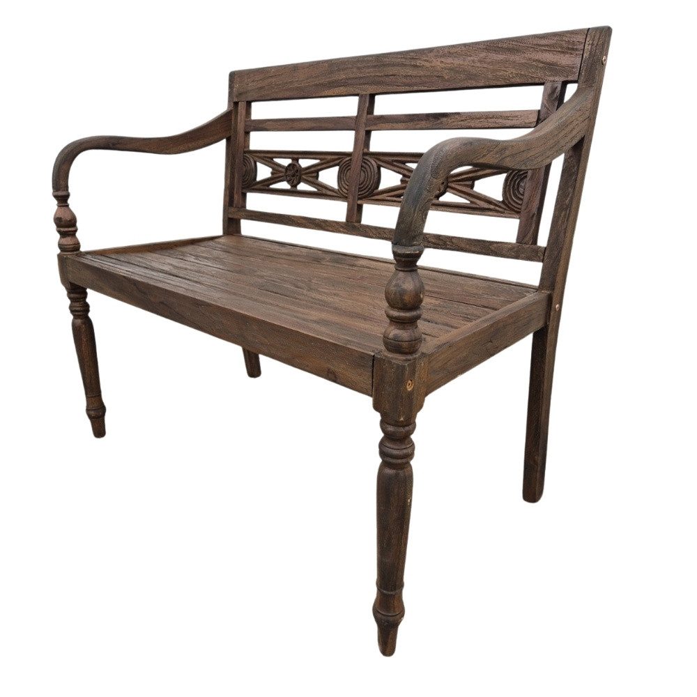 Das Holz dieser Sitzbank wird bei der Produktiont sorgfältig mit feinem Schleifpapier bearbeitet und anschließend chemisch behandelt, um eine gleichmäßige Farbgebung zu erzielen. Mit der Zeit bildet sich auf dem Teakholz die charakteristische silbergraue Patina, die diesem Material seinen besonderen Charme verleiht. Wenn Du den ursprünglichen Farbton wieder hervorheben möchtest, kannst Du die Patina einfach abschleifen – und schon sieht Deine Outdoor-Bank wieder wie neu aus!