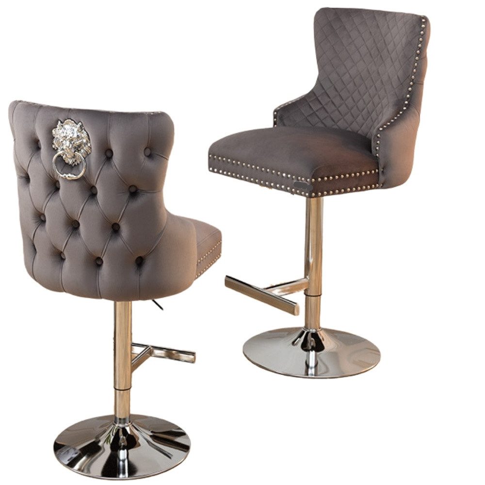Dieser höhenverstellbare Barstuhl ist mehr als nur eine Sitzgelegenheit. Er ist ein Statement. Das edle graue Samt gepaart mit dem glänzenden silbernen Edelstahlfuß und dem auffälligen Löwenkopf-Detail machen ihn zum absoluten Hingucker. Stell Dir vor, wie er das Licht einfängt und Deine Gäste beeindruckt!