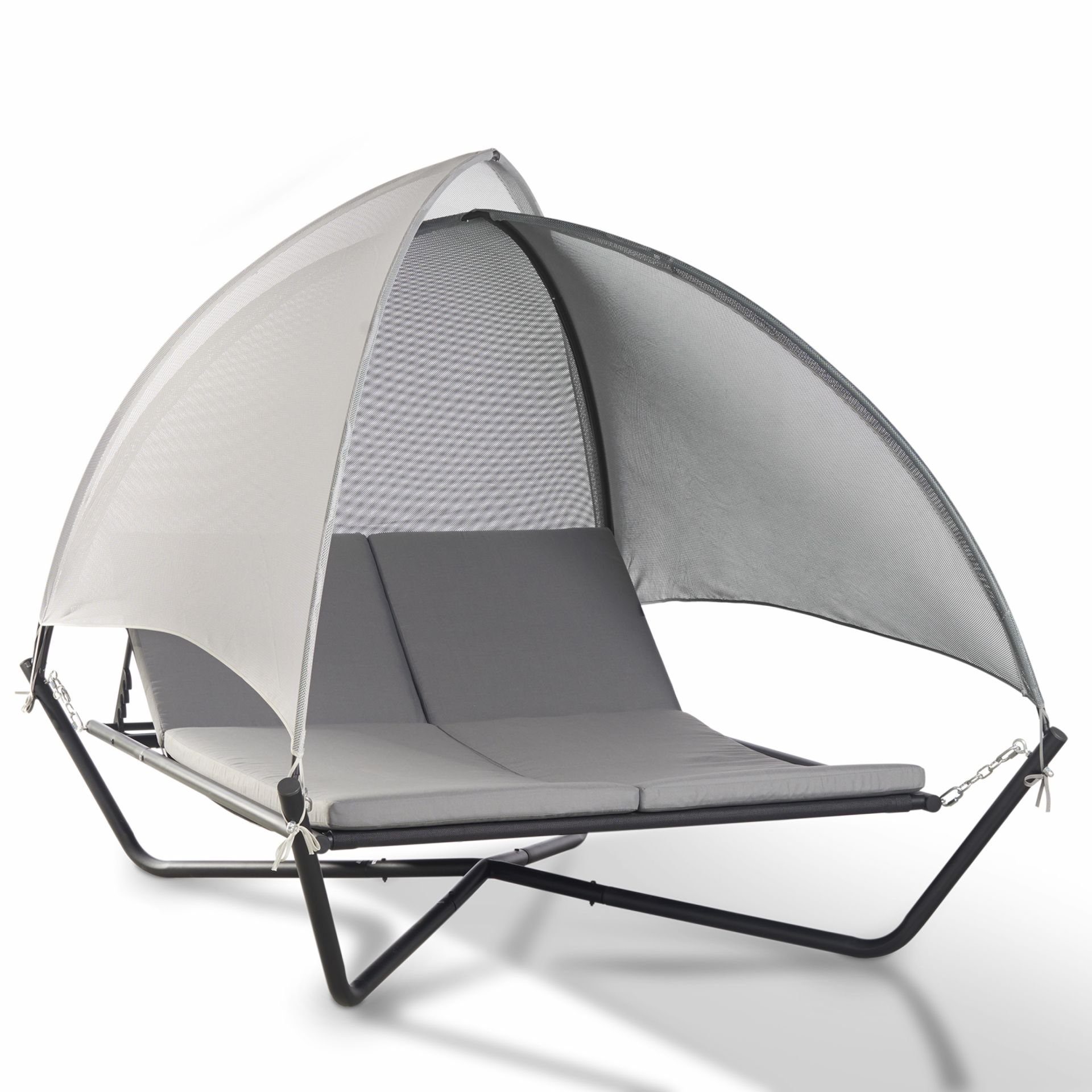 5-fach höhenverstellbare Rückenlehne Polsterauflagen Sonnendach Sitzhöhe 40 cm Liegefläche 214 x 141 cm Maximale Belastung: 2 x 110 kg Dachtextil aus 100 % Mesh - Polyester
