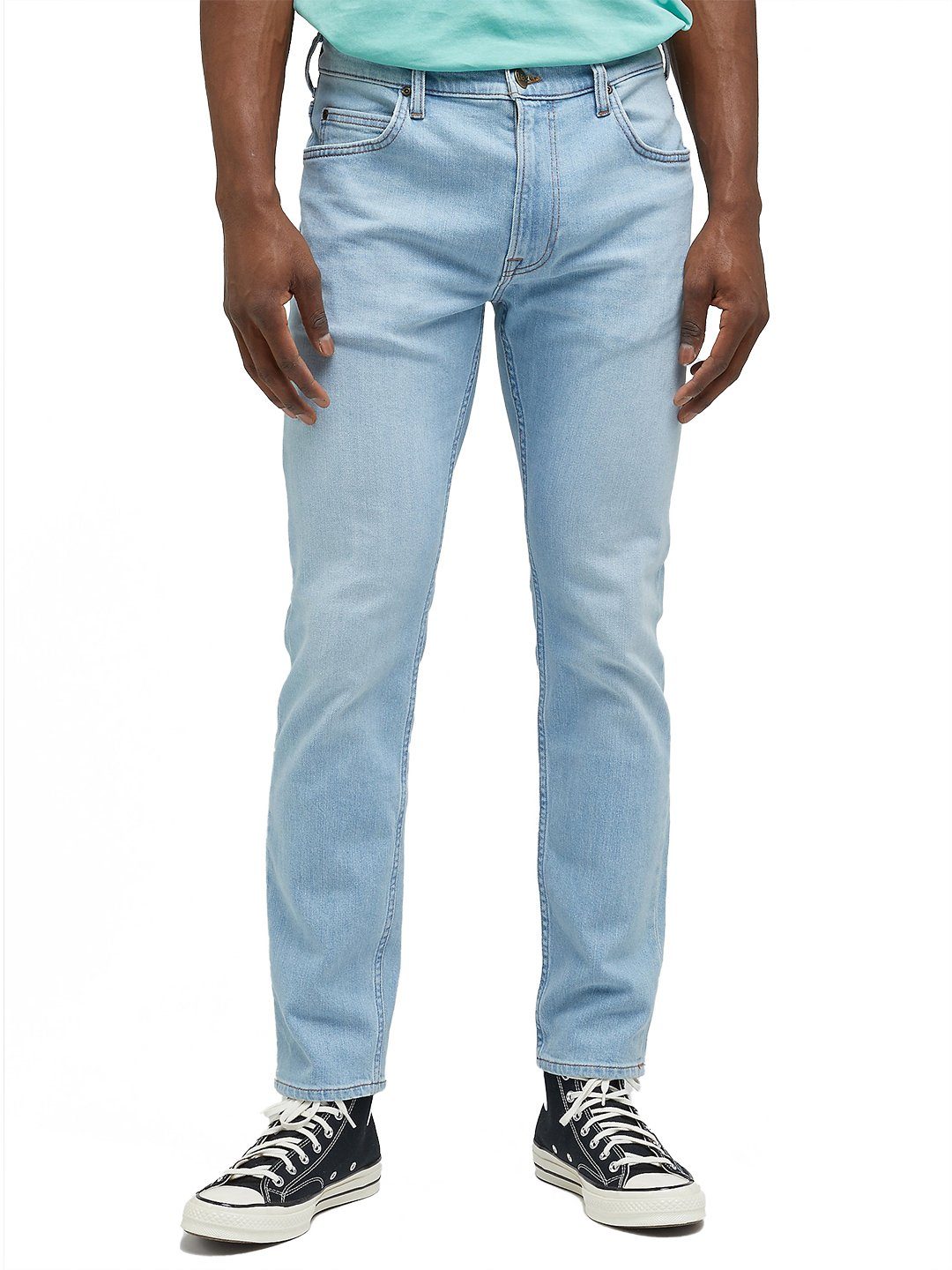 Hellblaue Slim Fit Jeans mit schmal zulaufender und verkürzter Beinpartie. Mit mittlerer Leibhöhe und Reißverschluss. Umweltschonende Crystal Clear-Färbung. Stretch Denim mit 95% Baumwolle, 3% Elastomultiester, 2% Elasthan. Das Model ist 186 cm und trägt Размер W32 L32.