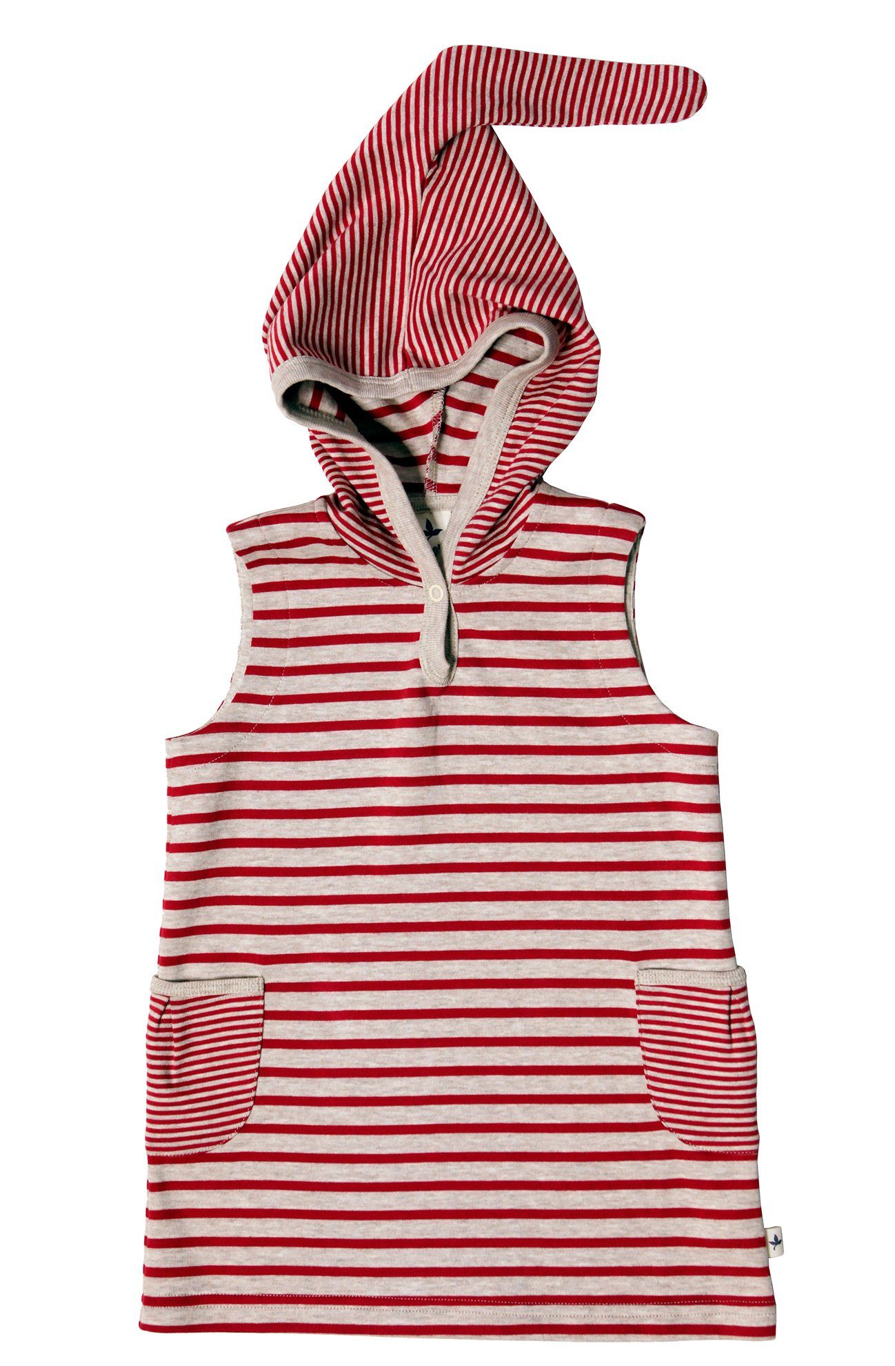 Kurzärmeliges Tunikakleid aus doppelseitigem Interlookstoff aus 100% Bio-Baumwolle (kbA), in einem konvetionellem Grau-Melange mit ziegelroten Streifen, erinnert uns sofort an das "Bremer" Wappen. Die fein geringelte Zipfelkapuze, sowie die zwei aufgesetzten Taschen, runden den Look ab. Besonders atmungsaktiv und angenehm zu tragen mit vorderen Holzknöpfen, die das Ankleiden erleichtern.