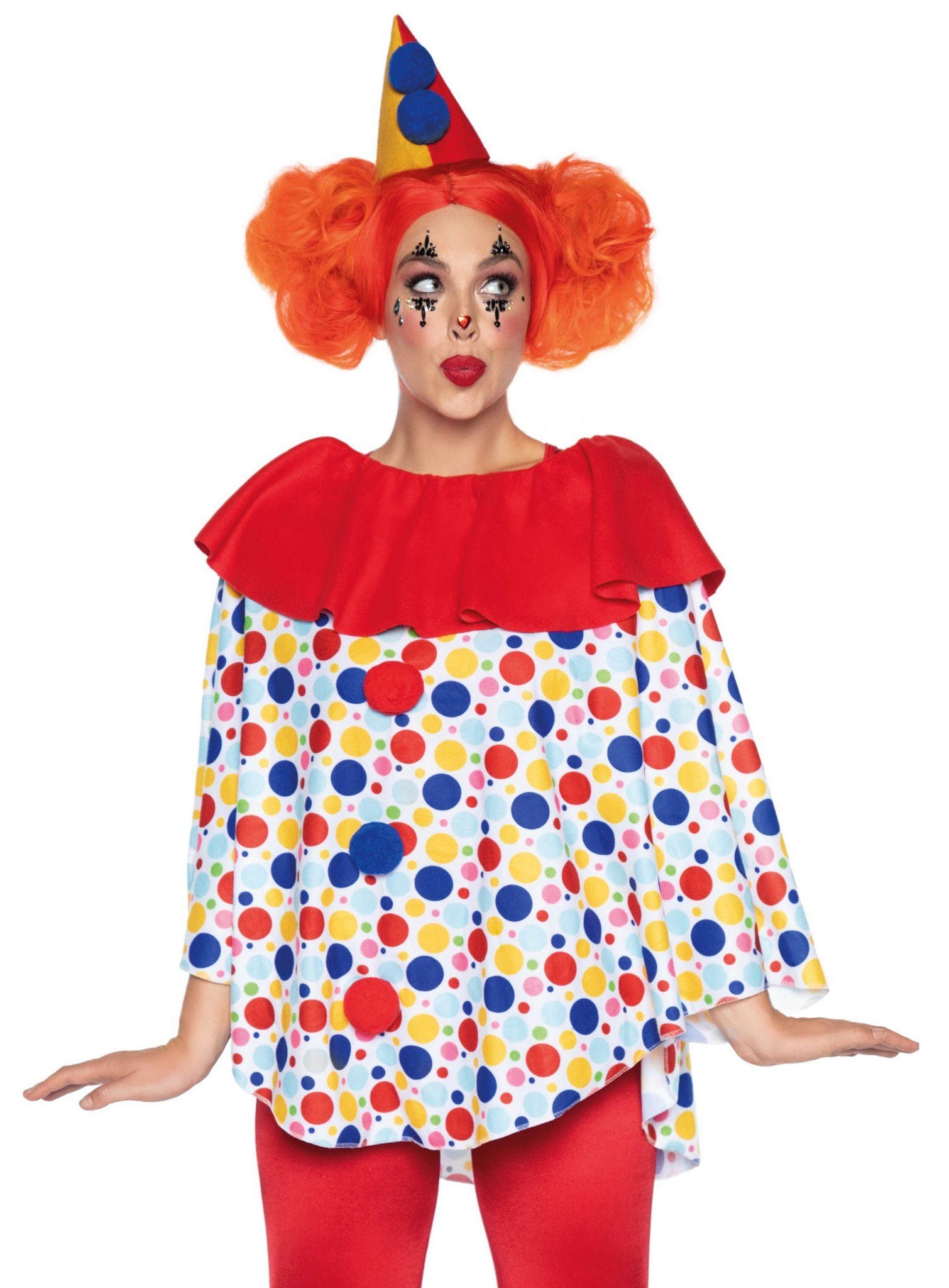 Ausstattung | - Clown Poncho zweiteilig- mit Poncho- mit Clownshut- ohne sonstige Accessoires |