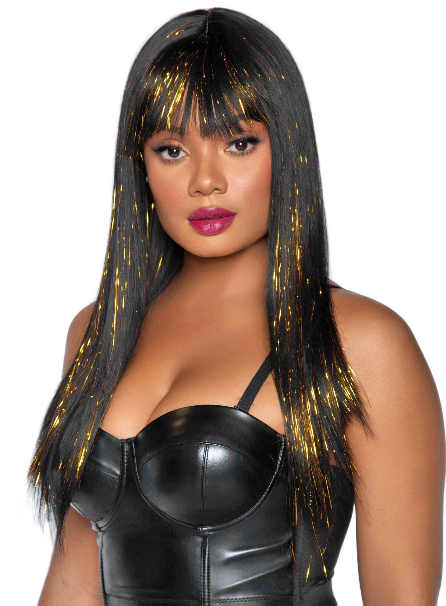 Lieferumfang | - Langhaar Perücke mit Pony schwarz-gold einteilig- mit elastischem Haarnetz für optimalen Halt und einfache Anpassung an jeden Kopfumfang- Einheitsgröße für Erwachsene |