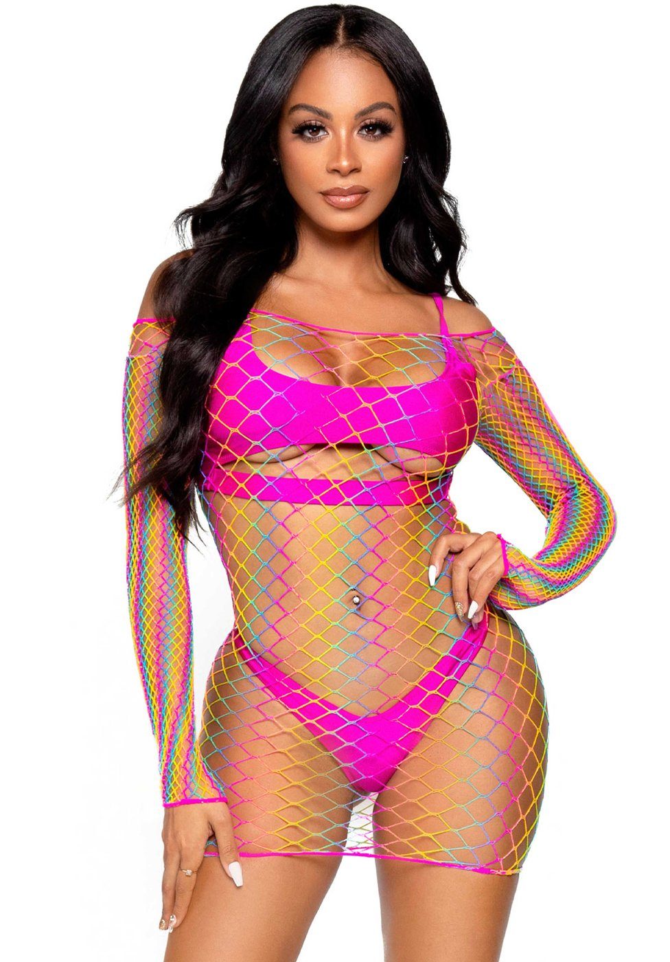 Langärmliges Minikleid mit Ombré-Regenbogen und Diamantnetz. Lieferung ohne Bikini.
