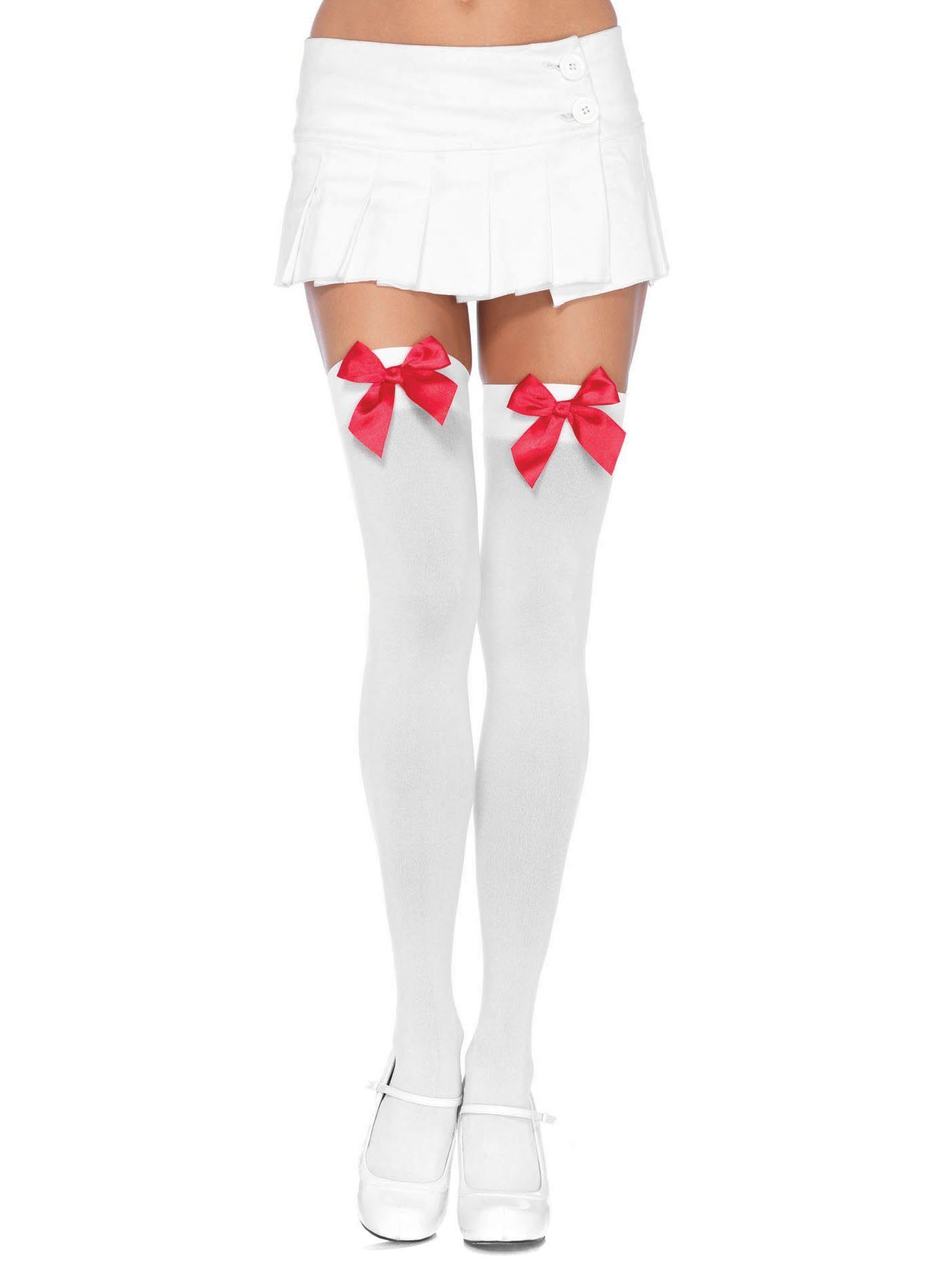 Ob für Euer Party- oder Burlesque-Outfit, Karneval und Mottoparty oder als trendy Accessoire im Alltag: Diese weißen halterlosen Strümpfe mit großer Schleife in Rot runden Euren Look perfekt ab und machen Eure Beine zu Eyecatchern, denen niemand widerstehen kann!