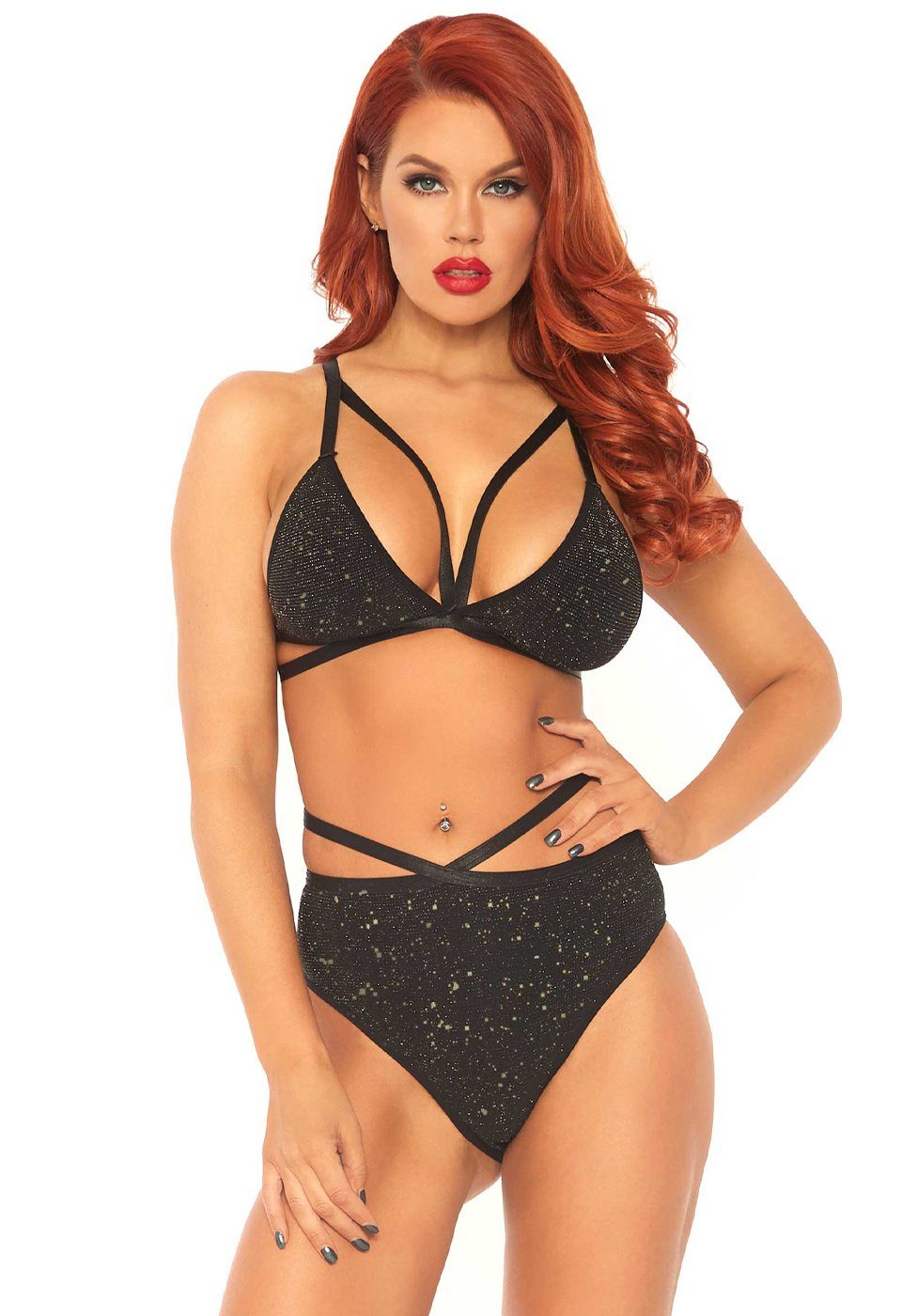 Leg Avenue Set: Bügelloser BH BH und High Waist Slip mit Glitzer- schwarz, gold (2-tlg) transparent