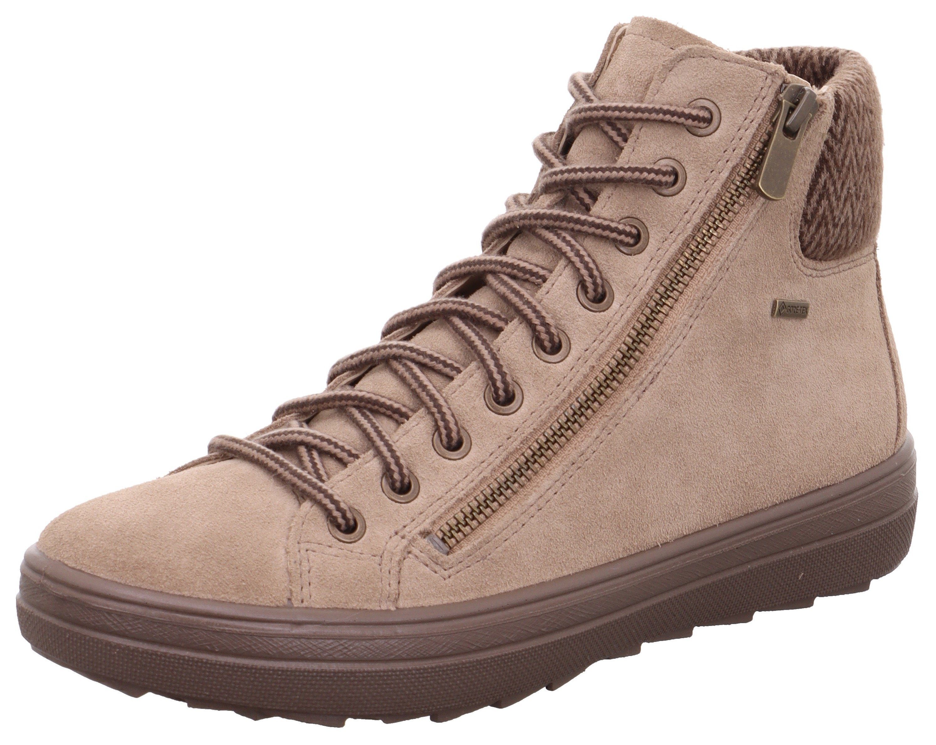 Die Gore-Tex®-Membran hat sehr feine Poren, die Wasserdampf von innen nach außen lassen. Regen und Schnee können jedoch nicht eindringen. Damit ist der Schuh sowohl atmungsaktiv als auch wind- und wasserdicht. Zehen und Füße werden vor frostigen Temperaturen geschützt. Die profilierte Synthetik-Sohle der Winterboots gibt dir auch auf unebenem Untergrund einen guten Halt. Innerhalb des Schuhs sorgt das Futter für eine angenehme Wärme. Der Plateauabsatz schafft zusätzliche Höhe und verbessert gleichzeitig den Komfort. Schmale bis normale Füße finden in diesen Winterboots der Weite F optimalen Komfort.