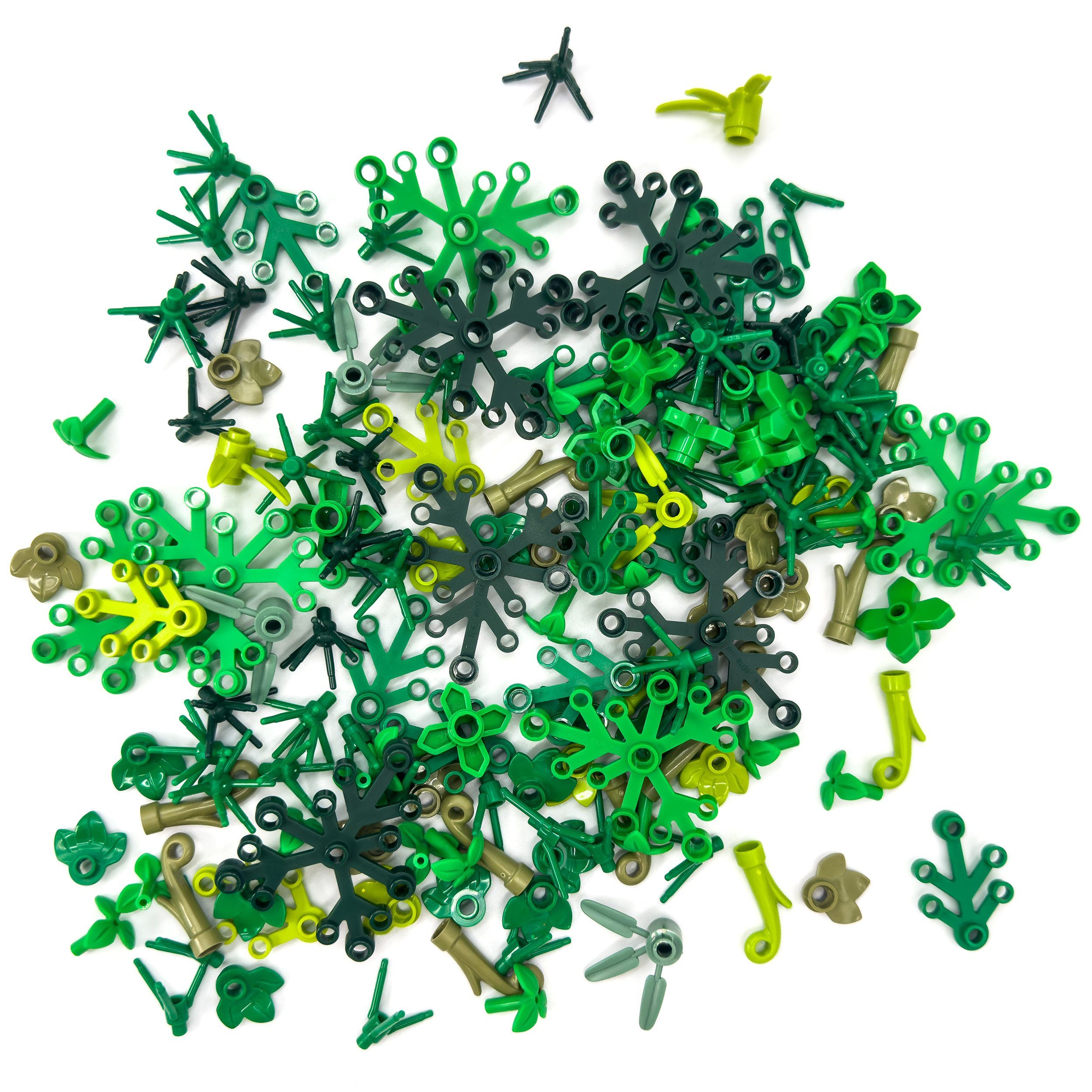 250 Stück LEGO Pflanzenelemente wie Blätter, Sträucher, Bäume, in verschiedenen Grüntönen.