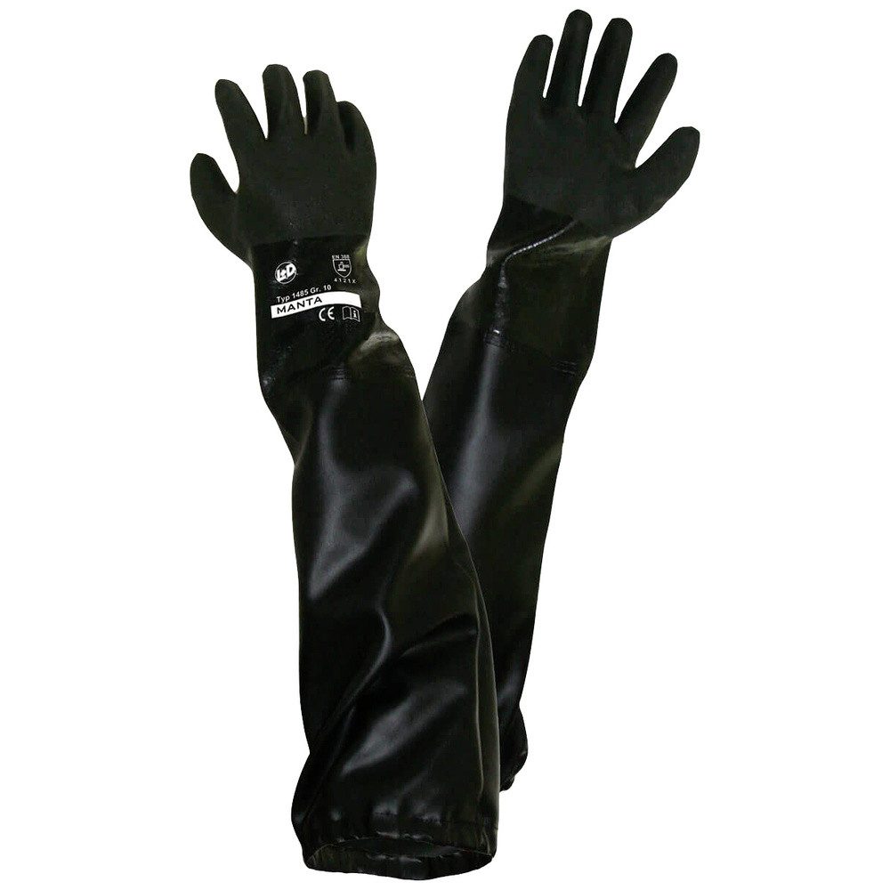 PVC-Handschuh in schwarz · Nahtlos getaucht · Trikotgefüttert · Flüssigkeitsabweisend · Extra lange und wasserdichte Stulpe · Ca. 70 cm lang