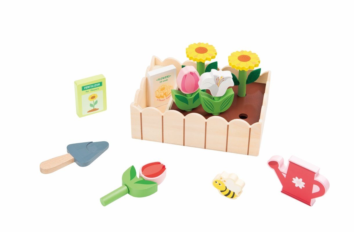 Lieferumfang | Holzbeet mit Zwischenfach, 1 Holzstein "Dünger", 1 Holzstein "Blumensamen", 3 Holzsteine "Blätter", 3 lange und 2 kurze Holzrollen "Blumenstiele", 4 Holzbausteine mit Blumenblüten-Motiv, 1 Holzbaustein "Gießkanne", 1 Holzbaustein "Schaufel", 1 Holzbaustein "Biene" |