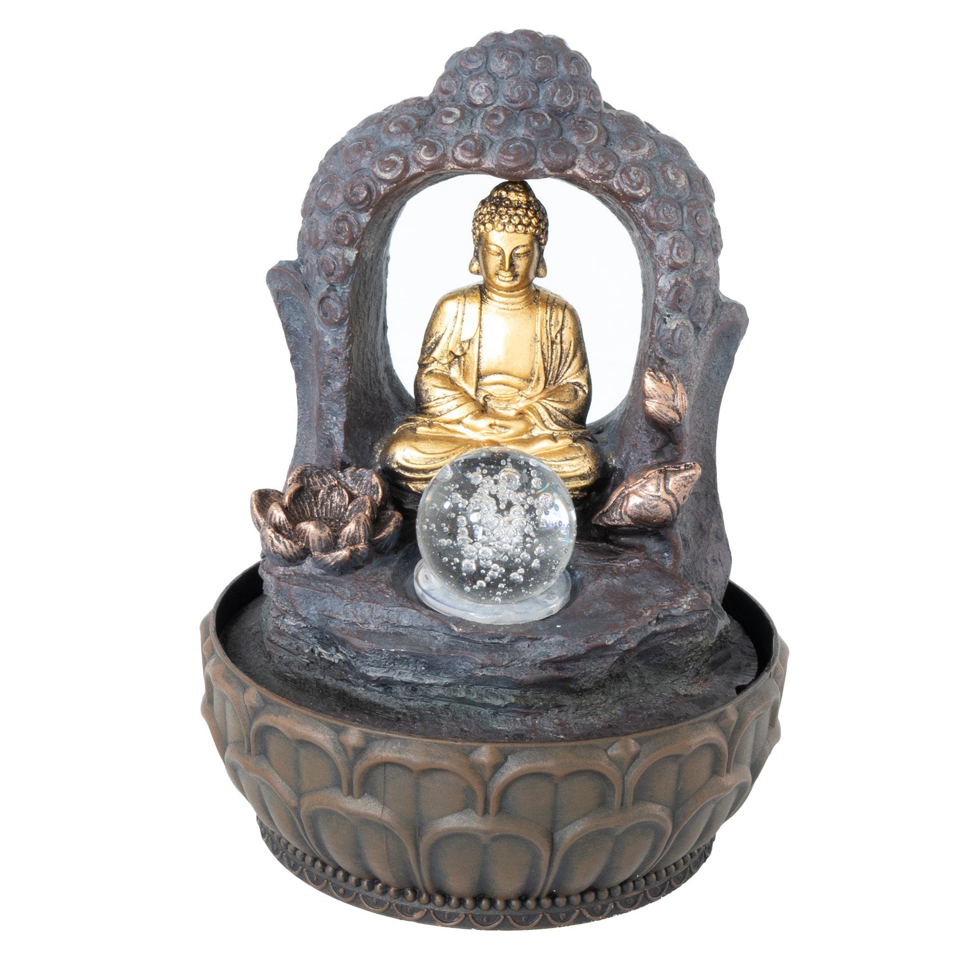Dieser dekorative Zimmerbrunnen mit fernöstlichem Flair kann Ihnen dabei helfen, im Büro oder bei Ihnen Zuhause eine angenehme Atmosphäre zu schaffen. Das leise Plätschern des Wassers wirkt beruhigend, der Anblick des steten Wasserflusses mit dezenter LED-Beleuchtung und der in Meditation versunkenen kleinen Buddha-Figur strahlt zusätzliche Ruhe und Harmonie aus. Das fließende Wasser sorgt außerdem für eine höhere Luftfeuchtigkeit und damit für ein verbessertes Raumklima, was besonders bei trockener Luft während der Heizperiode von Vorteil ist. Damit ist der Zierbrunnen nicht nur ein schönes Deko-Element, sondern zeichnet sich auch durch seine positive Wirkung auf Körper und Geist aus.
