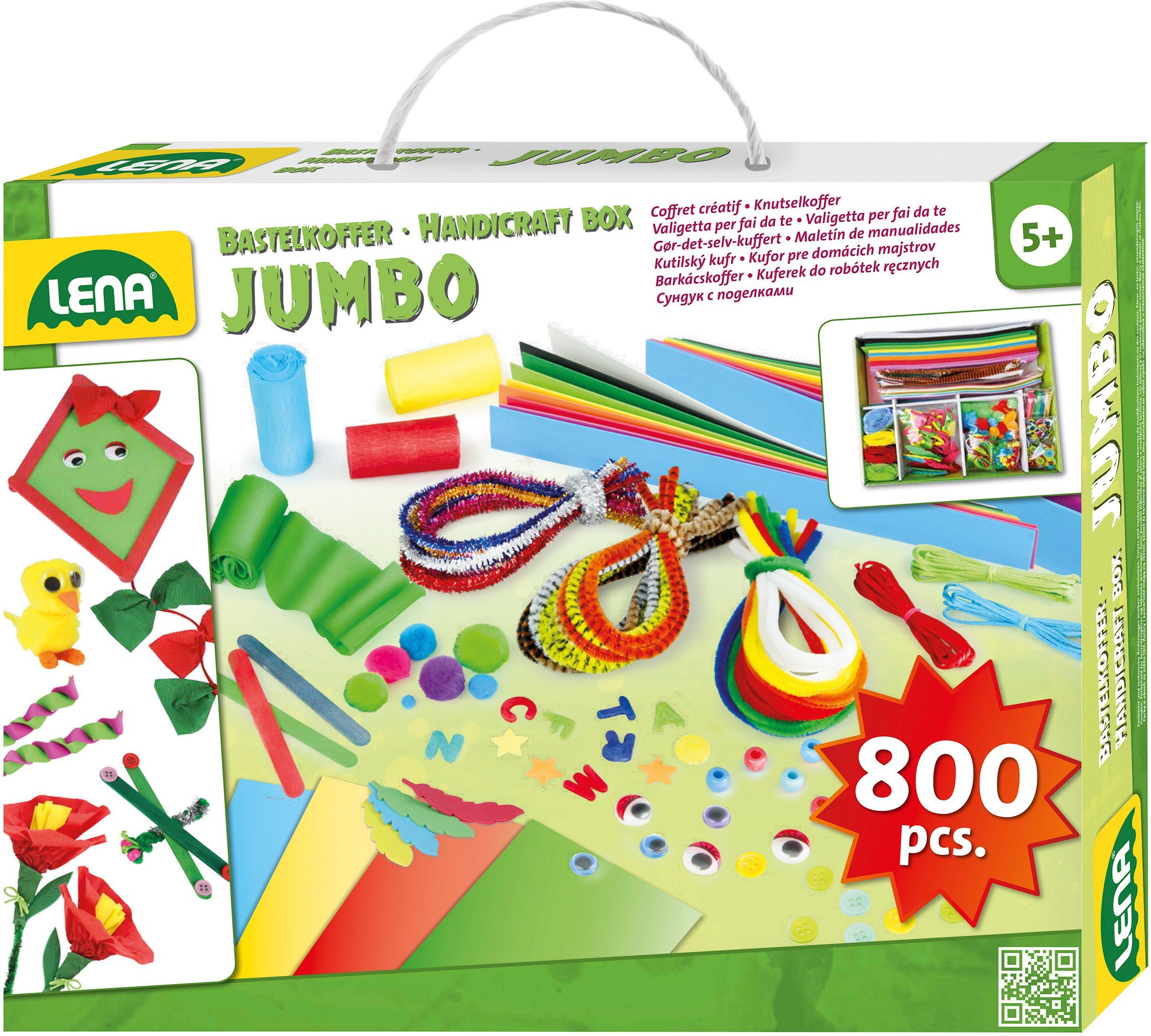 Ausstattung | Kreppband, Kulleraugen, Moosgummi-Federn, Moosgummi-Streifen, Moosgummi-Zuschnitte, Papier-Streifen, Perlen und Knöpfe, Pfeifenstopfer, Pompons, Satinbänder, bunte Eiscreme Sticks, buntes Papier |