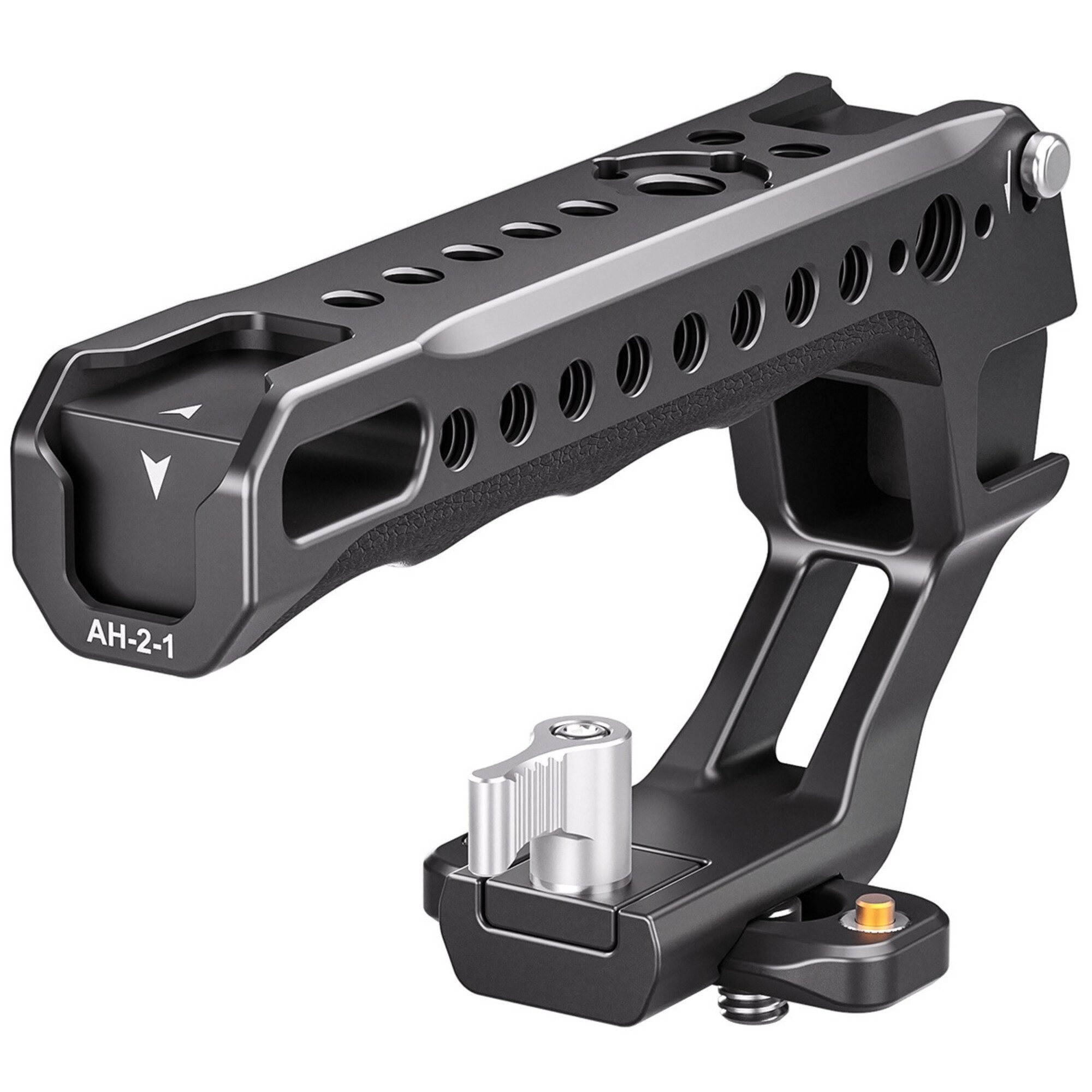 Dieser Handgriff kann mit jedem Leofoto-Kamerakäfig kombiniert werden. Er bietet selbst wiederum zahlreiche Anschlussmöglichkeiten für Zubehör. Über einen Schnellverschluss kann der Griff von der am Käfig verschraubten Schiene leicht abgezogen werden.