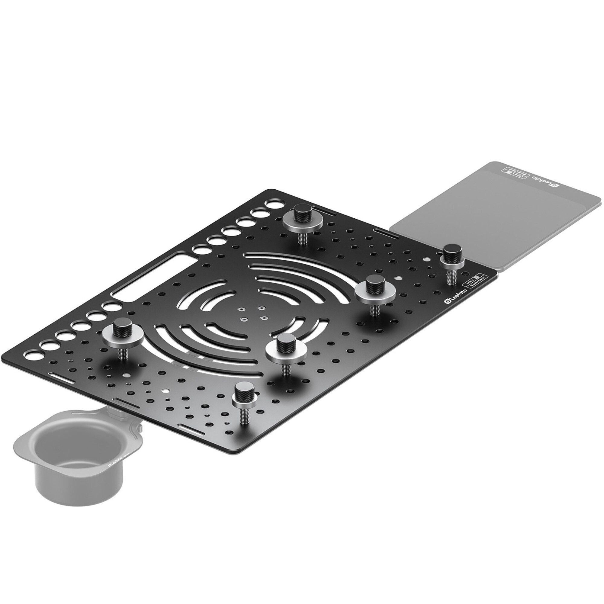 Die eigentliche Laptophalterung hat die Abmessungen 460mm x 310mm und bietet auch Laptops mit einer großen Bildschirmdiagonale ausreichend Fläche. Die 5mm starke Aluminiumplatte liefert eine hervorragende Stabilität mit geringem Gewicht. Die 4 Klemmschrauben sind frei positionierbar und die Klemmflächen sind mit weichem Silikonmaterial belegt, um ihr wertvolles Equipment vor Beschädigungen zu bewahren und sicher an Ort und Stelle zu halten. Zahlreiche Bohrungen und der Durchgriff ermöglichen eine optimale Kabelführung und erleichtert den Transport.