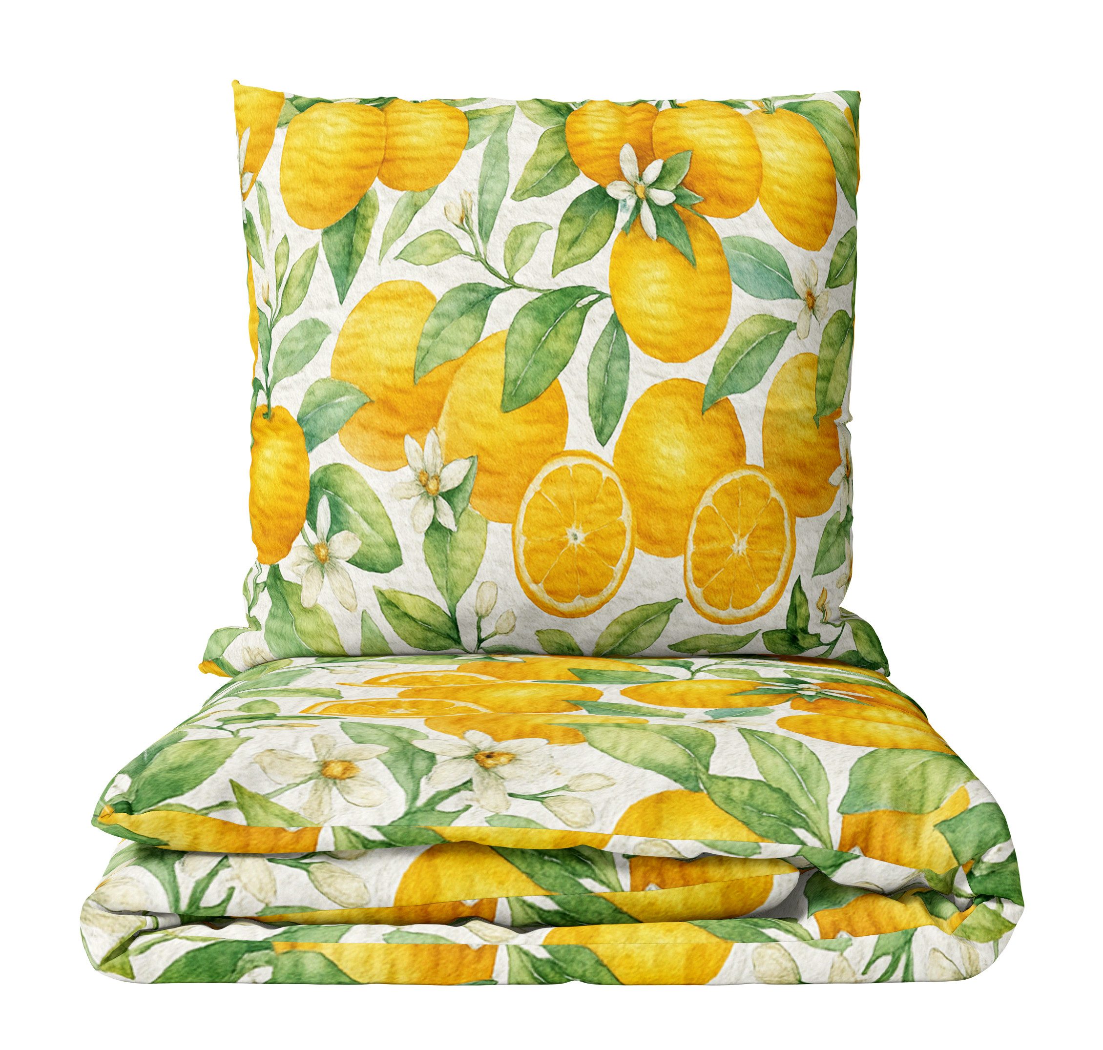 Das frische Design mit Orangen und grünen Blättern in lebendigen Farben schafft eine sommerliche Atmosphäre und ist gleichzeitig ein stilvoller Blickfang.