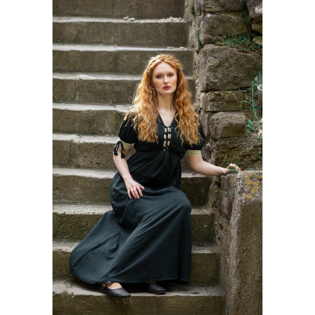 Das lange Sommerkleid ist aus leichtem Baumwollstoff gefertigt und somit gut geeignet für die wärmere Jahreszeit. Das Kleid besitzt kurze Ärmel und verzierte Tunnelbänder an den Ärmelenden. An der Vorderseite des Kleides hat es eine lange Schnürung, die es an verschiedene Körperformen anpassbar macht und da es zweifarbig ist, wirkt sich diese Schnürung gut auf das Gesamtbild aus.