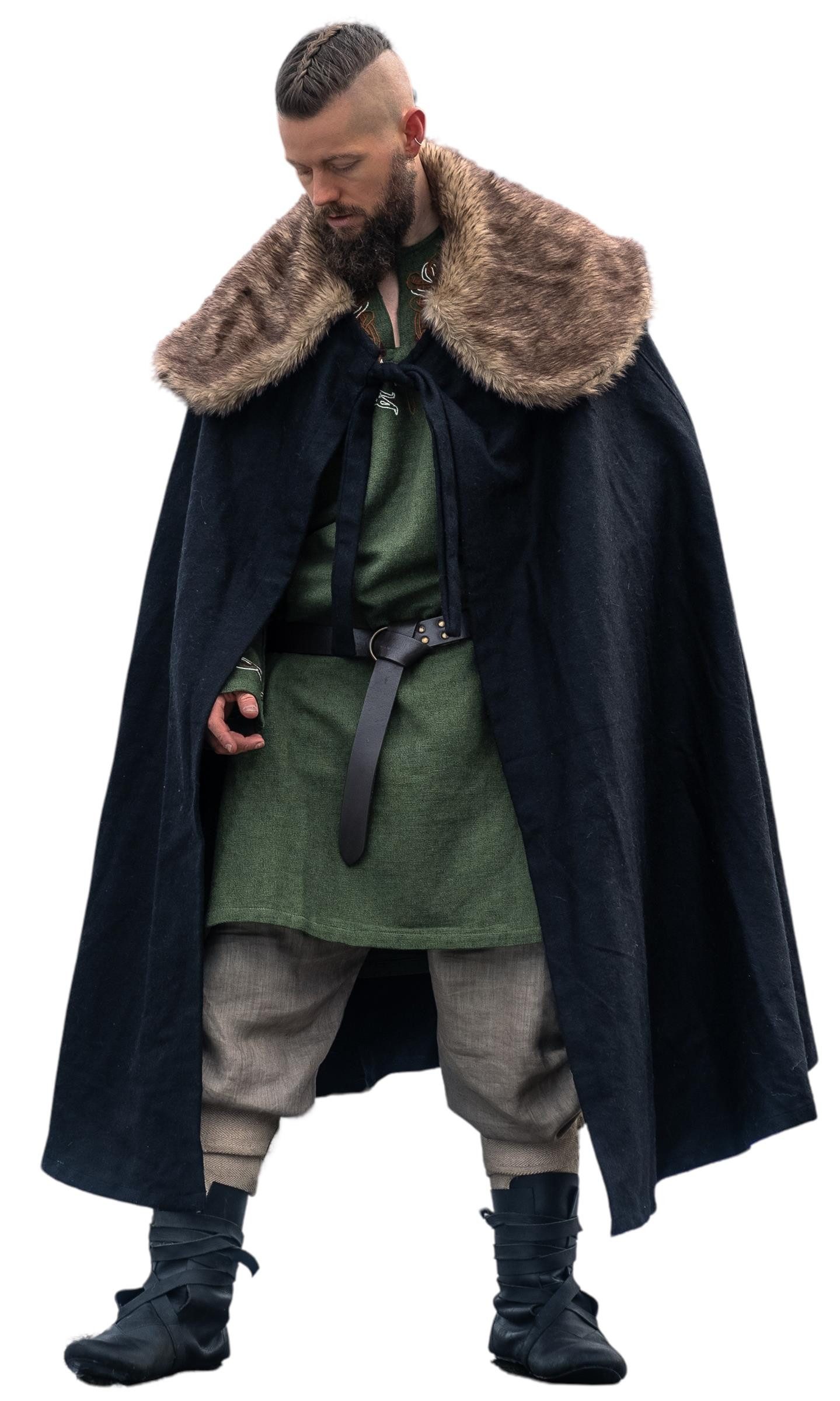 Entdecke unseren Wikinger-Umhang "Janne", der dich auf all deinen Abenteuern begleitet und dir den ultimativen Wikinger-Look verleiht. Mit einer beeindruckenden Stoffweite von 231 cm sorgt er für eine majestätische Erscheinung, während der angenähte Kunstfellüberwurf deinem Look eine kraftvolle Eleganz verleiht. Der Umhang wird vorne einfach gebunden und bietet somit Komfort und Funktionalität in einem. Lass dich von der hohen Qualität des schweren Wollgemischs überzeugen, das bei leichtem Regen wasserabweisend wirkt.