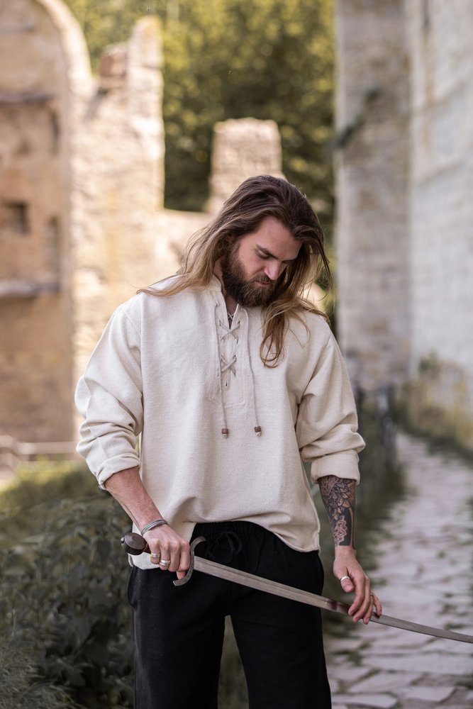 Charakteristisch an diesem Hemd ist die weite Schnürung am Halsausschnitt, welcher mit einer Kordel geschnürt ist. Er besitzt zudem einen Stehkragen.