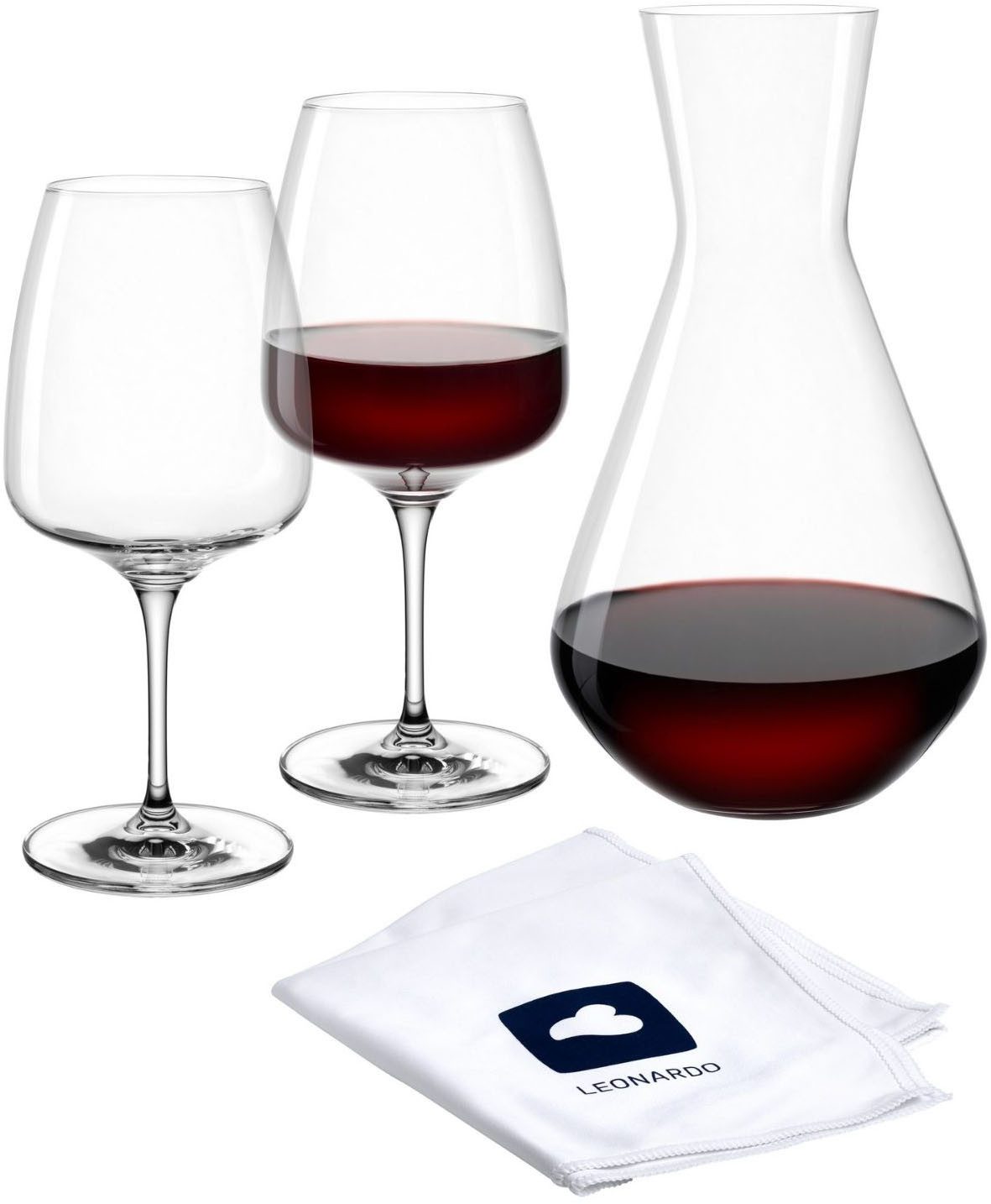 Lieferumfang: 1 Karaffe, 2 Weingläser 500 ml + Poliertuch, Maße Poliertuch: 0,1 x 60 x 35 (HxBxT), Maße Weinset: 25,7 x 24,5 x 19,3 cm (HxBxT)