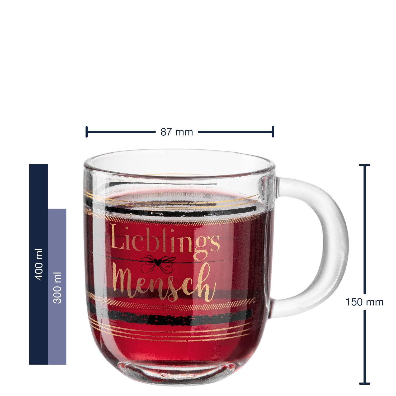 Lieferumfang & Maße: 4 Geschenk-Tassen, Maße pro Glas-Tasse: 10 x 12,5 x 8,7 cm (HxBxT), 380 g, 300 ml Nutzinhalt, 400 ml randvoll