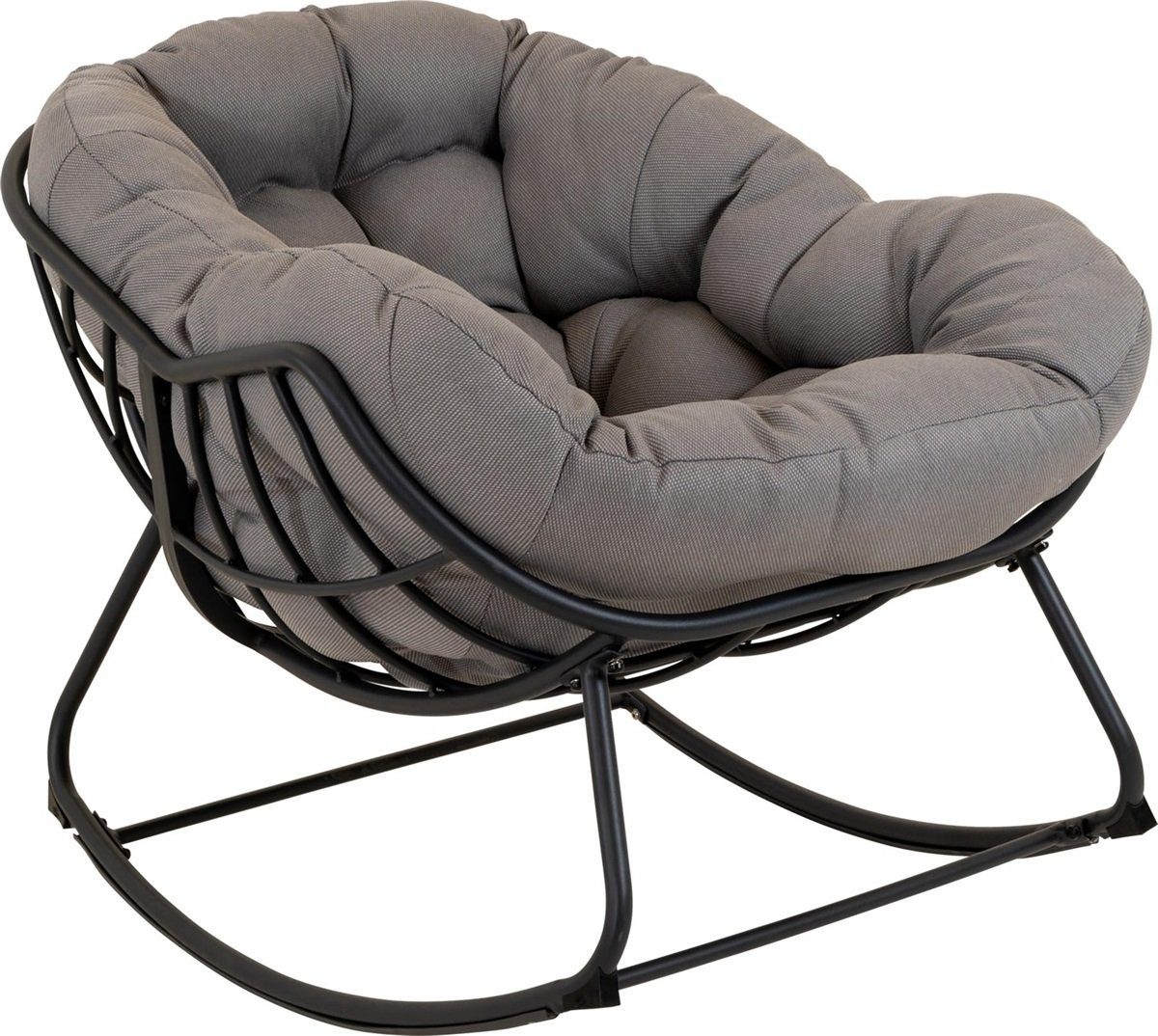 Der Schaukelsessel besticht durch sein modernes und gleichzeitig zeitloses Design. Der matte schwarze Aluminiumrahmen verleiht dem Sessel eine elegante Optik, während das große, weiche Sitzkissen für höchsten Sitzkomfort sorgt. Der graue Stoff des Kissens ergänzt das edle Design und fügt sich harmonisch in jede Outdoor-Gestaltung ein.