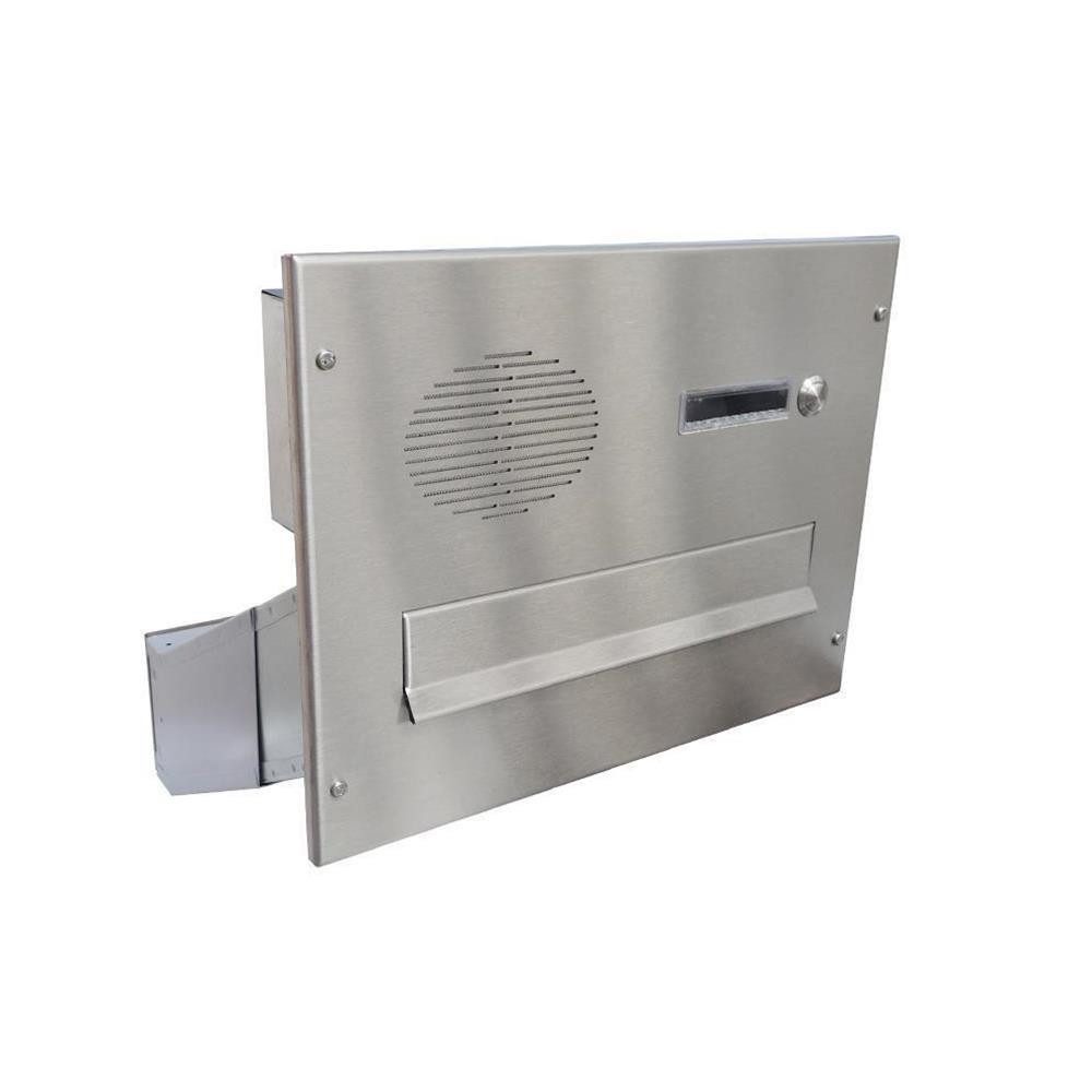 Der D-041 Durchwurfbriefkasten in Edelstahl mit Klingel und Sprechsieb ist die ideale Lösung für schmale Mauern. Dank seiner diagonalen Form bietet er mehr Volumen als herkömmliche Briefkästen gleicher Mauerstärke. Die schräge Bauweise ermöglicht ein reibungsloses Durchgleiten der Post bis zur Entnahmetür, sodass Ihre Post sofort griffbereit ist.