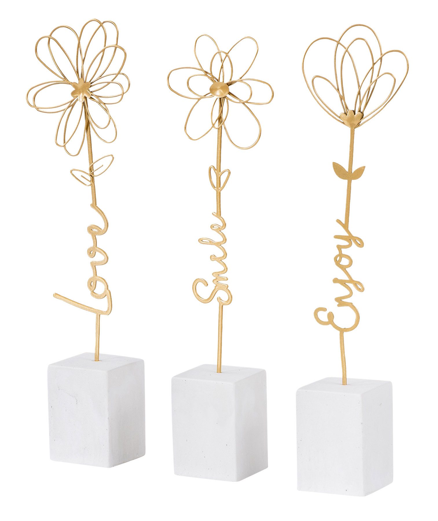- Lieferumfang: Sie erhalten das abgebildete 3er Set Deko-Blumen "Smile", "Love" und "Enjoy" auf Betonsockel (Ohne Deko)