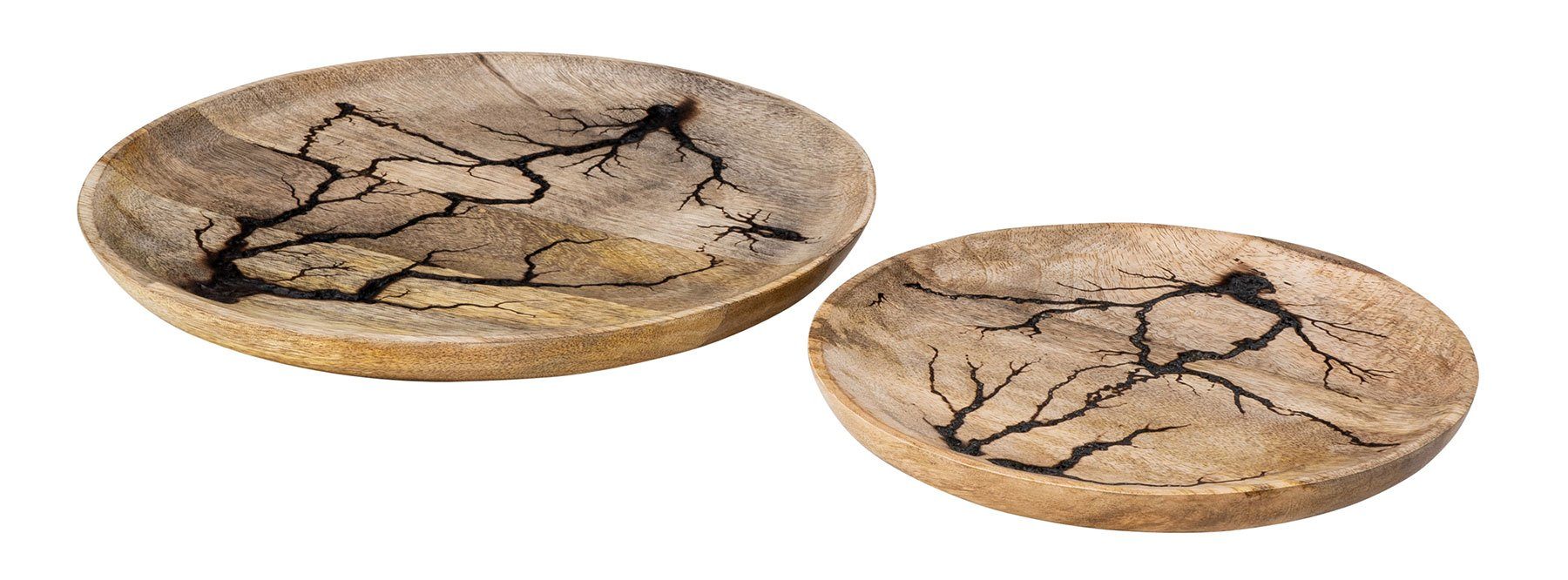 Absolut einzigartig und individuell verleiht dieses 2teilige Teller-Set eine kunstvolle Note. Die Teller sind aus natürlichem Mangoholz hergestellt, das für seine Haltbarkeit und seine stilvolle Maserung bekannt ist. Die Holzteller sind handgefertigt. Jedes Exemplar enthält ein einzigartiges, eingebranntes Muster, was die Teller zu einem absoluten Highlight machen. Die Kombination aus dem individuellem Design und der Natürlichkeit verleiht jedem Teller eine einzigartige Persönlichkeit und eine beeindruckende Optik. Mit ihrem zeitlosen Stil passen die Mangoholz-Teller zu verschiedenen Einrichtungsarten und sind vielseitig einsetzbar z.B. zur Präsentation von Speisen oder als Ablage.