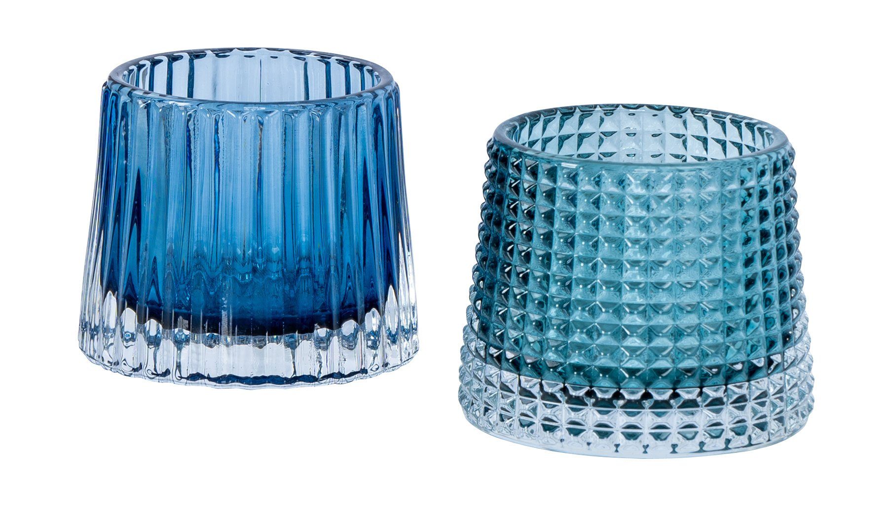 Maße & Material: Die blauen Kerzenhalter aus Glas haben eine Maße von je B x H x T 8 x 7 x 8 cm