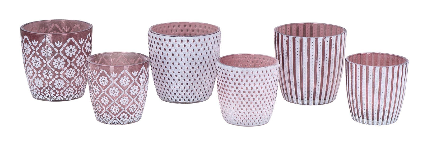 Ein wunderschönes Set Teelichthalter, das mit seiner eleganten Ausstrahlung und seinem bezaubernden Farbton in jedem Raum eine romantische Atmosphäre schafft. Die Kerzenhalter aus Glas sind in Altrosa/Rosa lackiert und mit weißen Mustern verziert. Der zarte Rosaton, durch welchen das Kerzenlicht sanft strahlt, verströmt einen Hauch von Vintage-Charme. Trotz des eleganten Retro-Chics, verkörpern die Windlichter ein modernes Flair und werden durch die unterschiedlichen Muster zu einem Blickfang in jedem Raum. Die Kerzendeko zieht nicht nur auf dem Esstisch, Regal oder der Kommode die Blicke auf sich - auch als besonderes Geschenk für Freunde oder Familie eignen sich diese Teelichthalter.